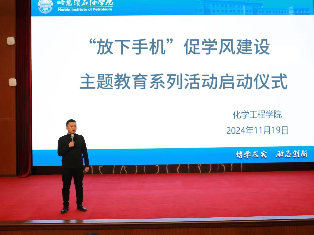 为切实加强学院学风建设,深入贯彻落实《欧博abg游戏登录入口“学风建设年”实施方案》与《欧博abg游戏登录入口学生学风建设实施方案》相关要求,并积极响应《欧博abg游戏登录入口学风建设“放下手机”主题教育系列活动方案》,坚持五育并举,全面提升学生综合素质,化学工程学院于 2024 年 11 月 19 日在图书馆报告厅举行“放下手机”促学风建设主题教育系列活动启动仪式。此次仪式由团总支书记兼 2024 级辅导员冯海龙主持,2024 级全体学生参加。