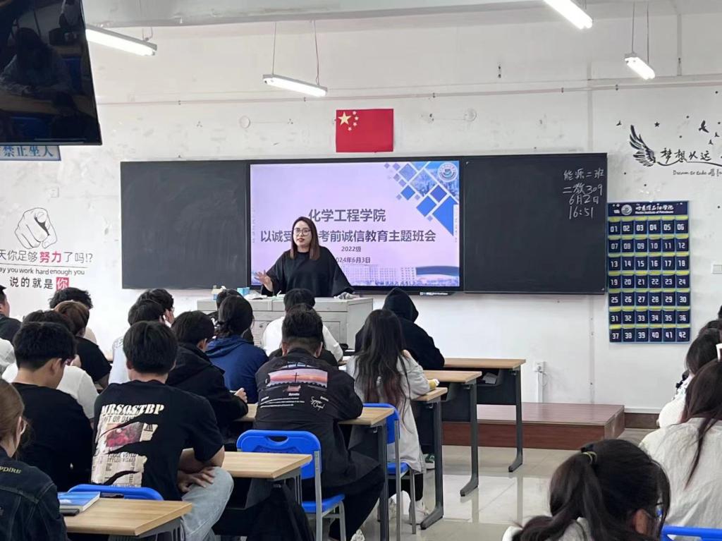 为强化考风考纪教育,切实加强学风建设,进一步端正考风、严肃考纪,增强同学们的诚信考试意识,化学工程学院于2024年6月1日-3日各年级辅导员开展考前诚信教育主题班会。