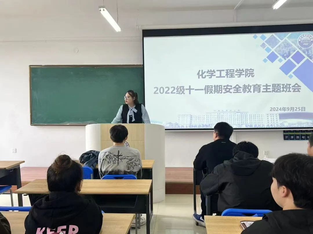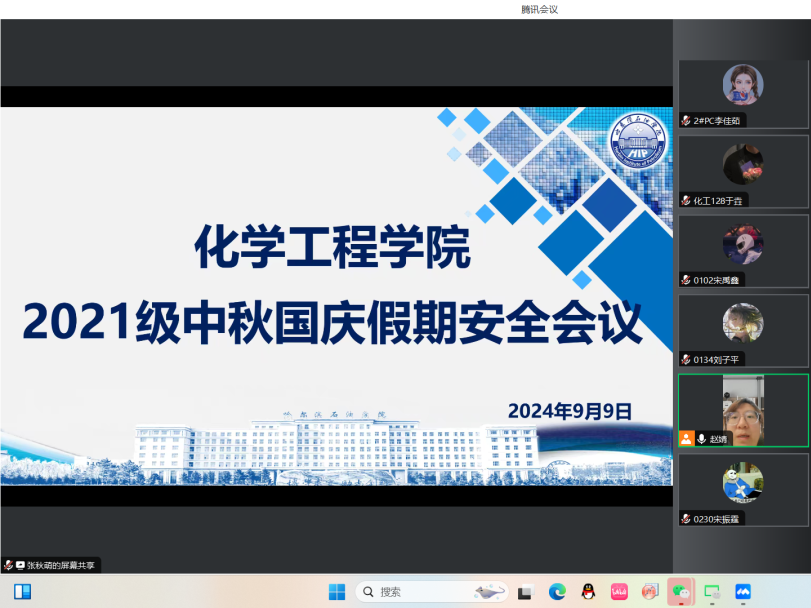 正值祖国七十五年华诞,国庆假期来临,为进一步提高学生安全防范意识,切实做好十一假期安全教育工作,2024年9月24-25日,化学工程学院各年级辅导员以线上线下结合的方式召开国庆假期安全教育主题班会,各年级同学参加了此次会议。