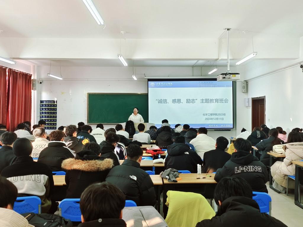 为深入贯彻落实党的二十大精神,进一步强化资助育人效果,广泛宣传资助育人成果,增强当代大学生诚信感恩意识和责任担当,2024 年 12 月 11 日,化学工程学院开展“感恩、诚信、励志”教育主题班会。班会由各年级辅导员主持,21 级、22 级、23 级、24 级全体学生参加。