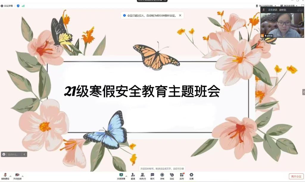 辅导员们从交通安全、消防安全、网络安全、防范诈骗等多个角度,为同学们敲响了安全警钟。并结合学校通知以及班级实际情况,详细地介绍了假期期间的安全注意事项,让学生们充分认识到假期安全的重要性。其中对寝室内务、防意外伤害存在的风险问题等相关事项进行了重点强调,引导学生深刻意识到存在的安全隐患、安全无小事,要时刻紧绷安全弦、提高安全防范能力,做好自身安全健康第一人。同时辅导员老师提醒学生们在假期期间合理安排时间,劳逸结合,文明出行,确保人身和财产安全,营造安全、健康、文明的良好氛围,平安愉快的度过假期。