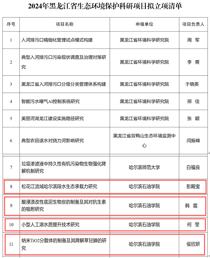 2024年12月27日,黑龙江省生态环境厅对2024年度黑龙江省生态环境保护科研项目进行了公示。我院彭殿宝副教授、韩霜副教授、何莹高级工程师、侯欣妍高级工程师所申报的项目获批为2024年度黑龙江省生态环境保护科研项目。