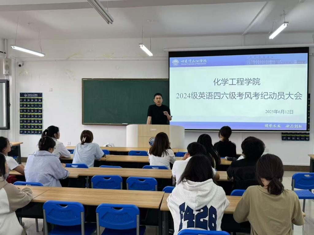 为强化学生诚信意识,进一步规范考试管理、严肃考风考纪、维护考试的公平公正、促进优良学风的养成。6月12日-6月13日,化学工程学院召开英语四六级考风考纪动员大会。会议由各年级辅导员老师主讲,2022级、2023级、2024级全体四六级考生参与。