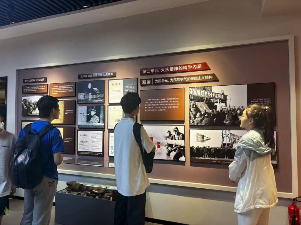 在铁人精神育人馆内,讲解员详细介绍了铁人王进喜的生平事迹以及他带领石油工人艰苦创业的感人故事。从铁人王进喜在玉门油矿的奋斗岁月,到响应国家号召奔赴大庆参加石油大会战,面对艰苦的条件和巨大的困难,用自己的实际行动诠释了“爱国、创业、求实、奉献”的铁人精神。新生们通过一幅幅珍贵的历史照片、一件件实物展品以及生动的场景复原,仿佛穿越时空,亲身感受到了当年石油大会战的火热场面,深刻体会到老一辈石油人不畏艰难、勇于拼搏的崇高精神。