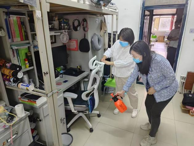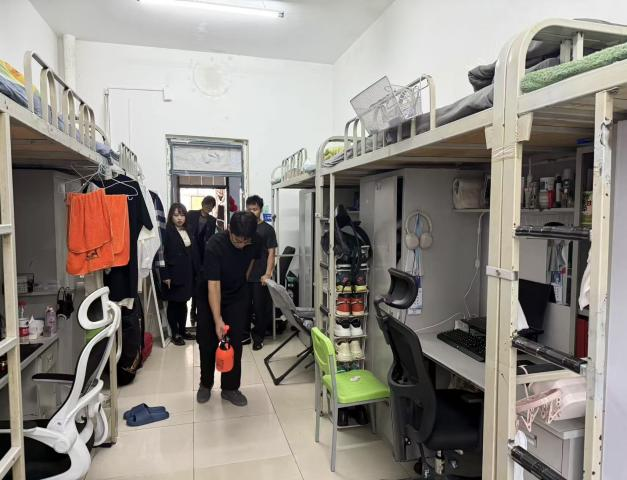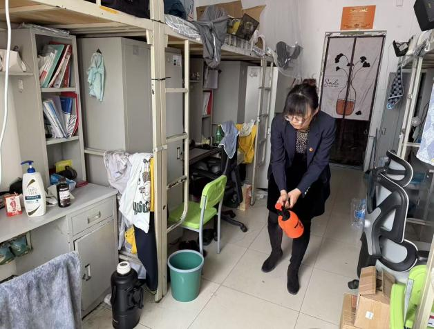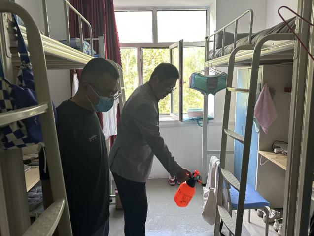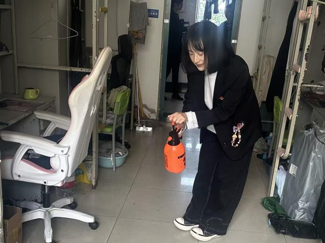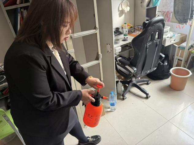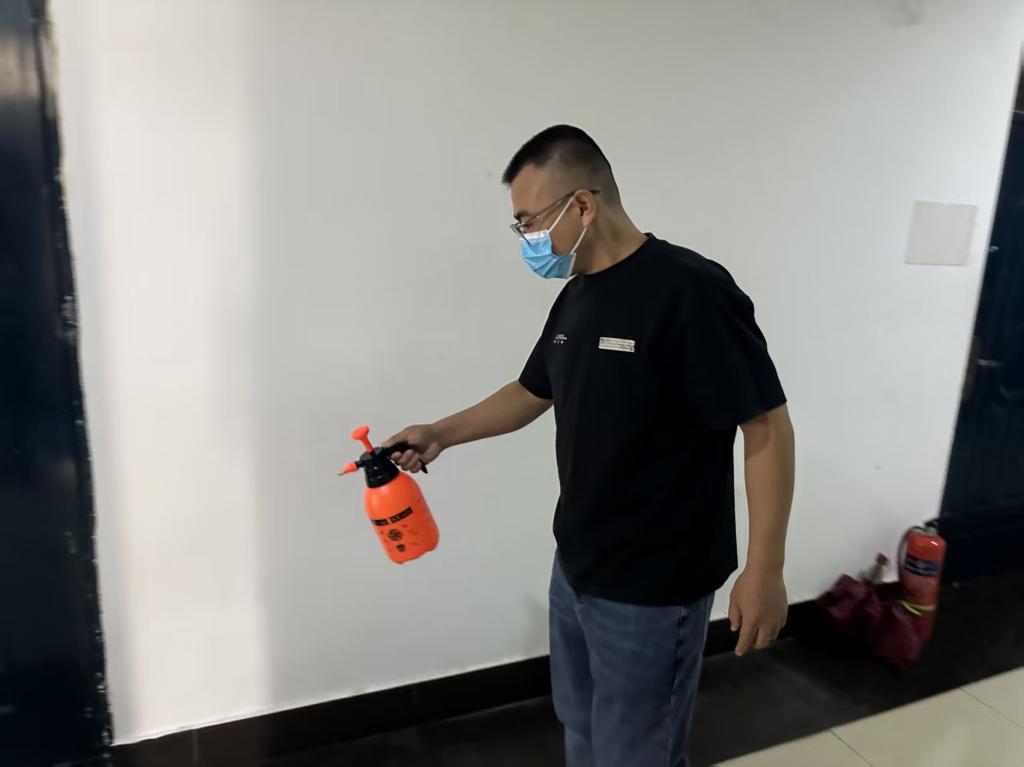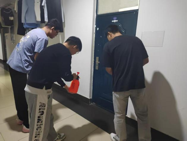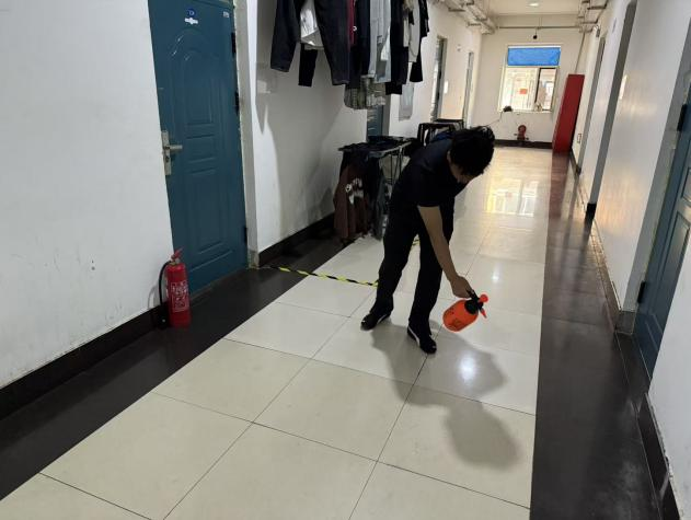 行动前,社区书记统筹部署,支部书记针对消杀标准、重点区域及安全规范开展专项培训,确保任务清晰、操作规范。活动中,全体人员分为多支小队,深入学生寝室及公共走廊,对门把手、桌面、卫生间、走廊扶手等高频接触点进行全面细致消杀。过程中,大家还耐心解答留校同学关于消杀流程、秋季传染病预防的疑问,将健康防护理念与党组织的关怀传递给每一位同学。