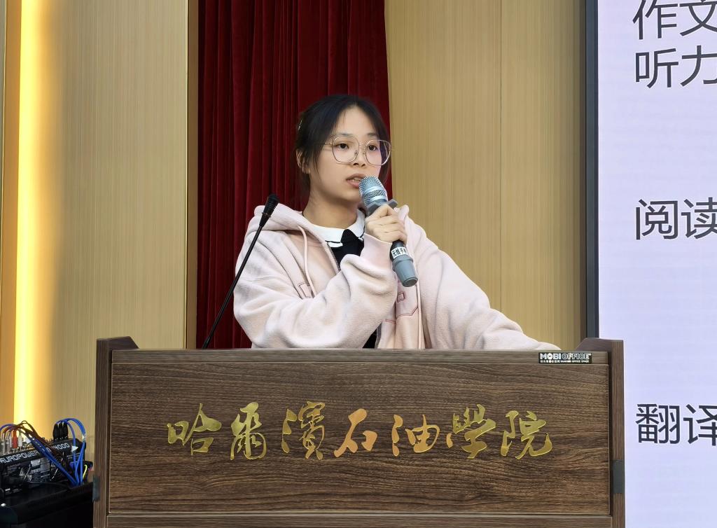 随后,陈佳锜同学聚焦听力题型展开深度讲解。她表示,听力是四六级考试的“重头戏”,也是许多同学的薄弱环节。她结合真题片段,详细拆解了短对话、长对话、短文理解等题型的命题规律,分享了“预读选项+抓关键词+听逻辑关系”的解题技巧。同时,她建议同学们日常坚持“精听+泛听”结合训练,精听真题原文打磨细节,泛听英文广播、影视剧培养听力敏感度,逐步提升听力理解能力。