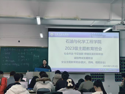 为切实防范冬季消防安全风险,压实宿舍安全管理责任,2025年12月3日,石油与化学工程学院开展消防安全主题班会与宿舍用电安全专项检查,通过“教育传理念、排查除隐患、师生共联动”的举措,扎实推进校园安全工作,全力保障全院师生生命财产安全,彰显学院安全管理成效。