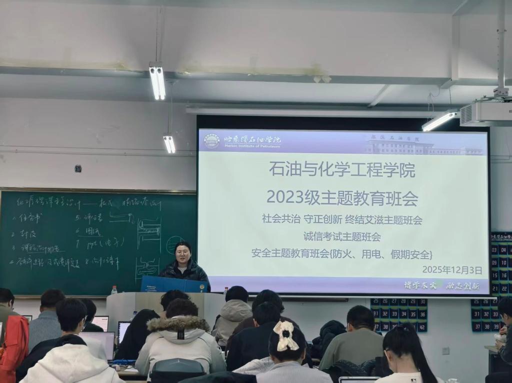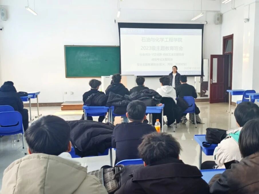 严肃考风考纪,弘扬优良学风,引导学生树立诚信观念,以严谨端正的态度迎接即将到来的期末考试。2025年12月4日石油与化学工程学院组织召开了“弘扬诚信学风 共筑严明考纪”诚信考试主题教育班会。会议由各级辅导员主持,全体同学共同参与。