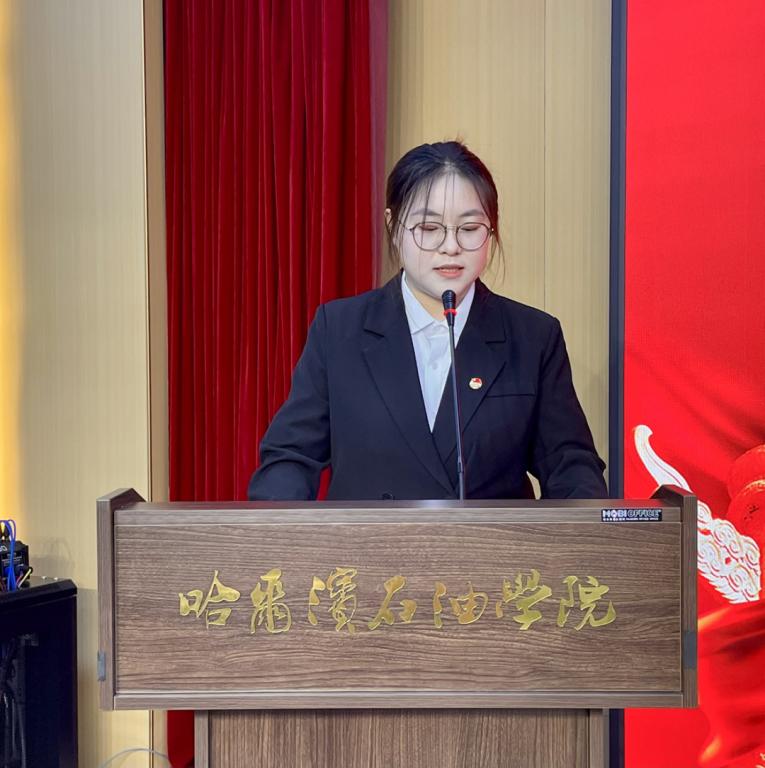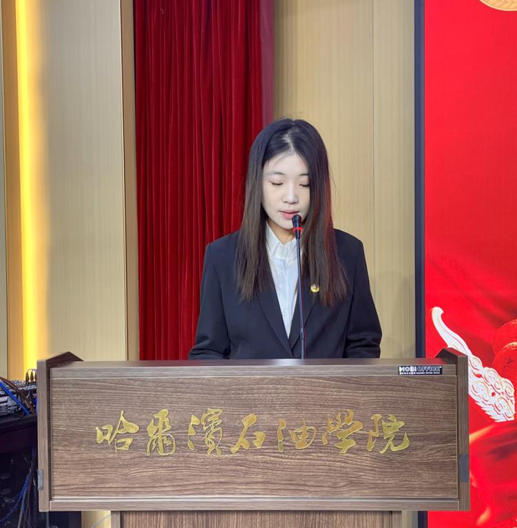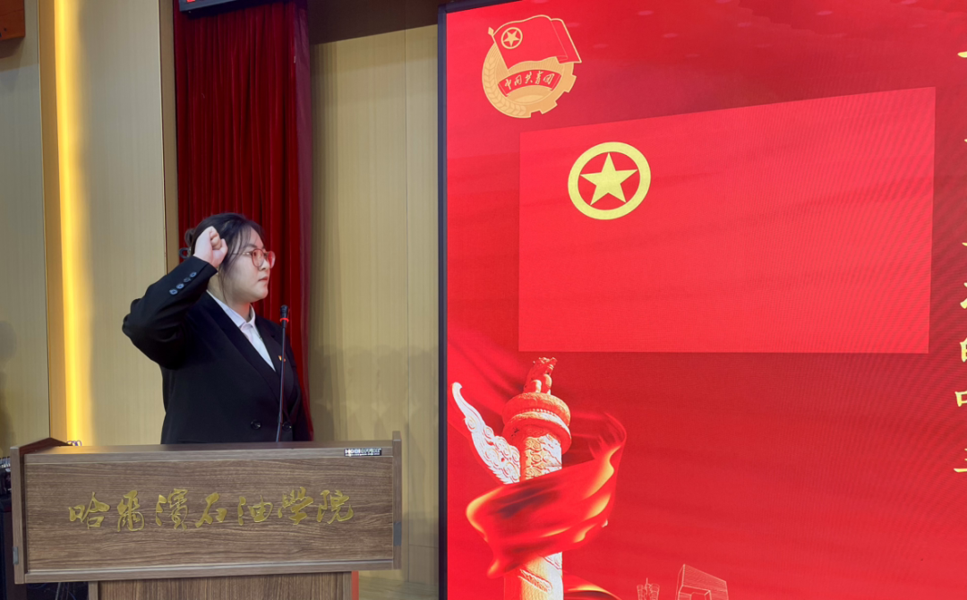 新团员代表刘偌彤登台发言。她坦言,成为共青团员是自己青春路上的重要里程碑,未来将以团员的标准严格要求自己,始终坚定理想信念,勤奋钻研专业知识,积极参与校园实践与志愿服务,把个人成长融入学校发展和国家建设中,用实际行动诠释新时代青年团员的责任与担当。