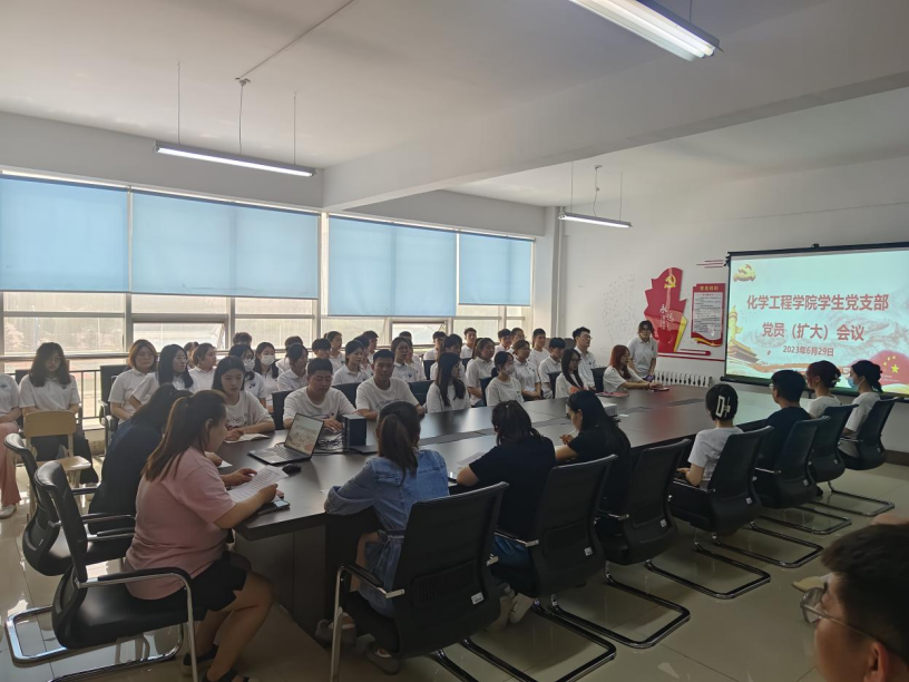 为进一步发挥党员先锋模范作用,加强党员与积极分子之间的联系,体现党员的先锋模范作用,2023年6月29日11时55分,化学工程学院于第二教学楼党员之家召开学生党支部党员(扩大)会议,会议由学生党支部书记于鑫主持,学院党总支书记张艳丛、党总支副书记赵婧、辅导员王小丽、2020级辅导员王喃出席会议, 2020级学生党员、预备党员,2021级预备党员、入党积极分子参加。