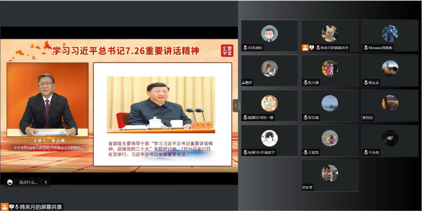 为进一步学习习近平总书记重要讲话精神,迎接党的二十大, 2022年8月5日20时,化学工程学院党总支组织师生党员观看习近平总书记在省部级主要领导干部“学习习近平总书记重要讲话精神,迎接党的二十大”专题研讨班上重要讲话解读。通过本次学习把习近平总书记重要讲话精神内化于心、外化于行,使其成为勇担大任、砥砺前行的精神力量,师生党员50余人参加此次学习。