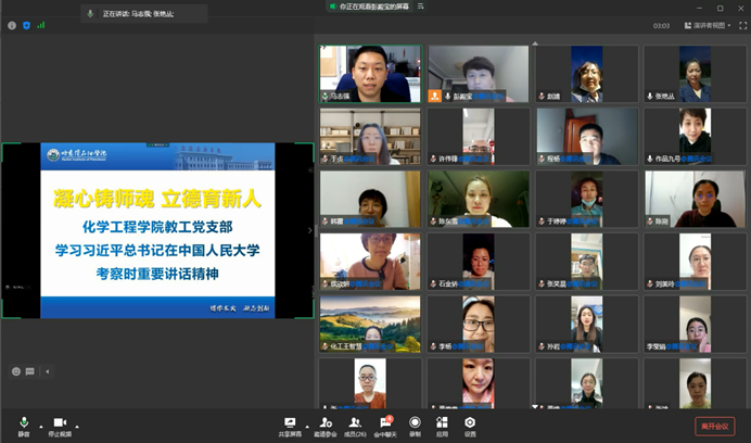 为学习宣传贯彻好习近平总书记在中国人民大学考察时重要讲话精神,做好黑龙江省高校思政中心学习“大接龙”活动,按照学校党委要求,2022年5月21日,化学工程学院教工党支部组织开展“凝心铸师魂,立德育新人”学习习近平总书记在中国人民大学考察时重要讲话精神活动。