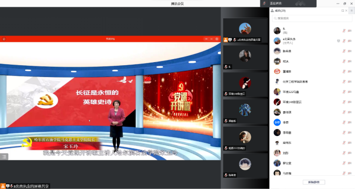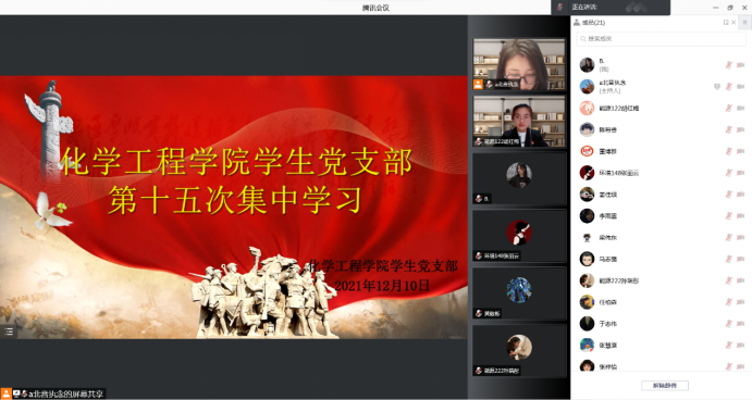 为深入学习宣传党的十九届六中全会精神,弘扬伟大长征精神,培养青年艰苦奋斗精神,2021年12月10日18时,化学工程学院学生党支部组织观看由宋玉玲老师主讲的以“中国共产党永恒的英雄史诗——长征”为主题的《党课开讲啦》,共52名学生党员参加学习。