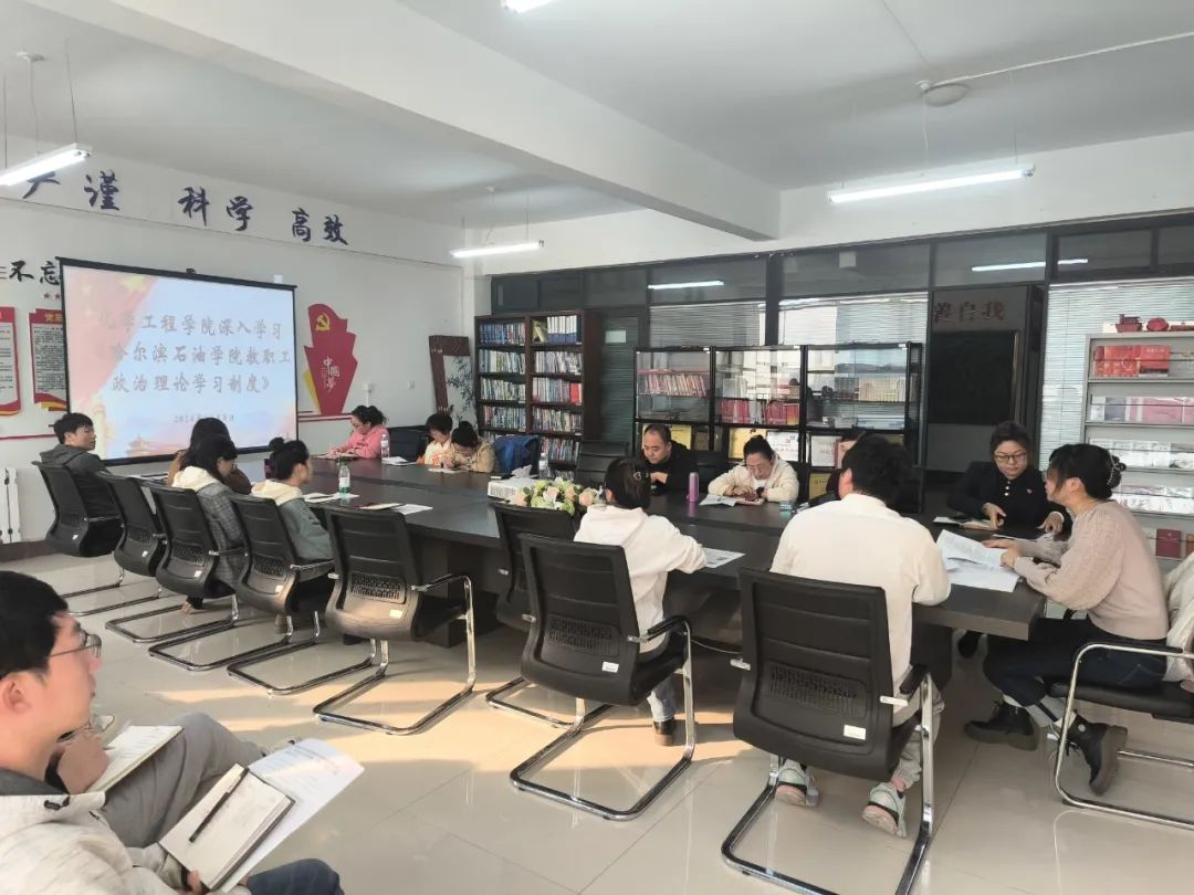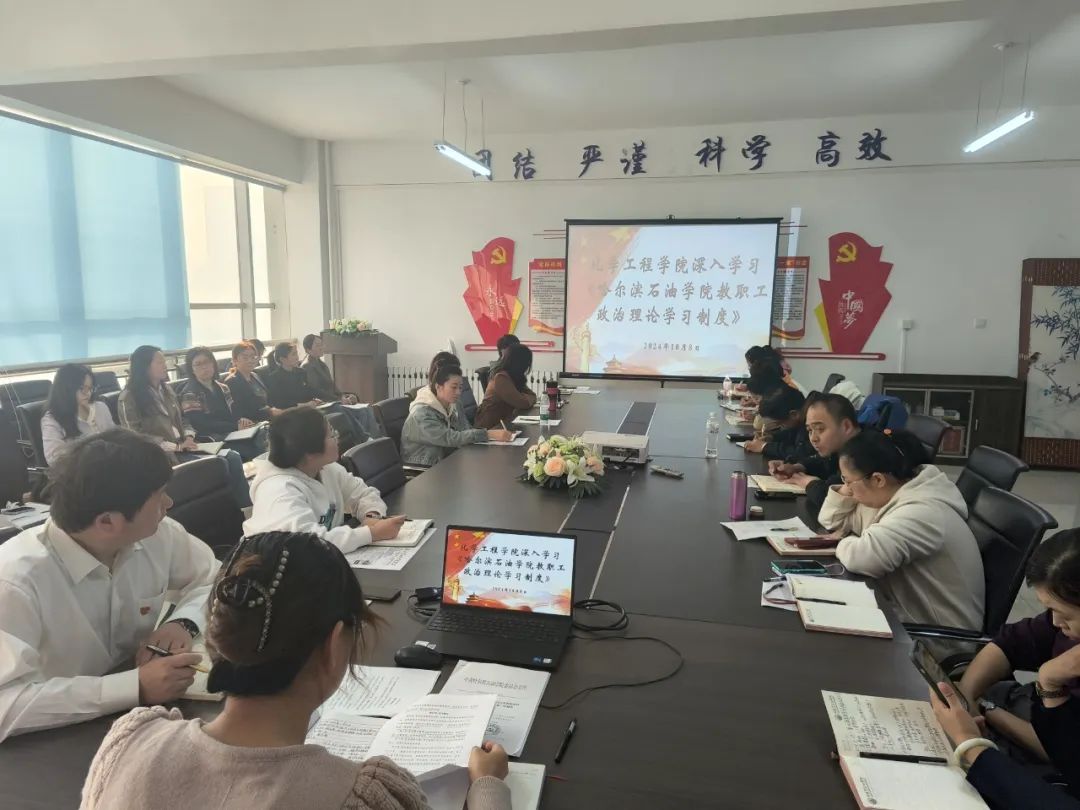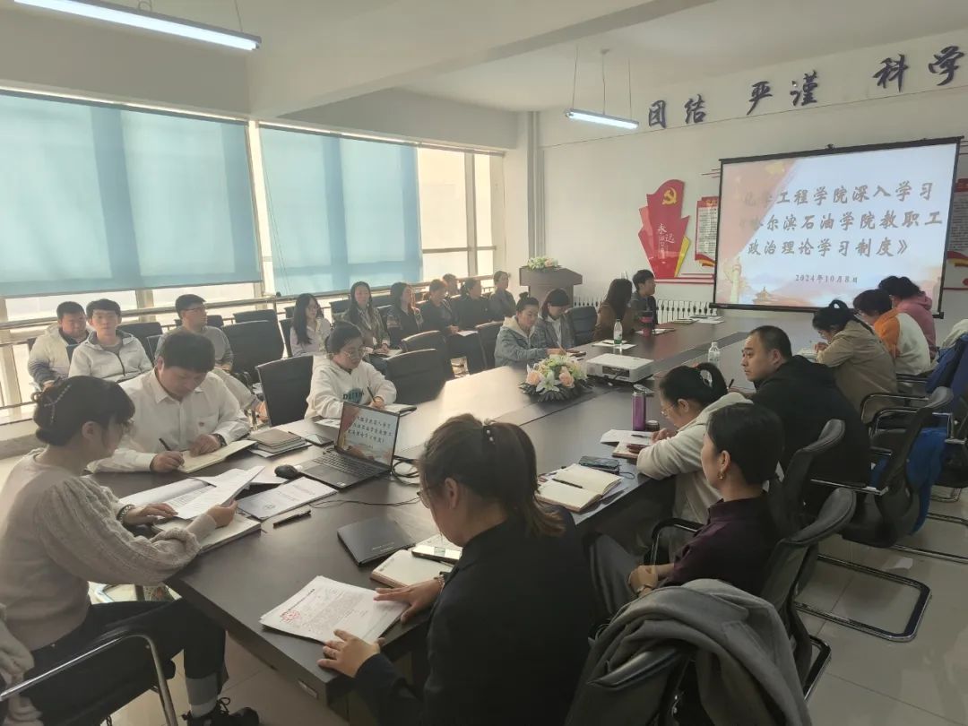 为深入学习贯彻党的二十届三中全会精神,进一步推进我院教职工政治理论学习制度化、规范化,不断提高教职工的思想政治素养,2024年10月8日,化学工程学院党总支组织全院教职工深入学习《欧博abg游戏登录入口教职工政治理论学习制度》和《欧博abg游戏登录入口学习宣传贯彻党的二十届三中全会精神工作方案》文件精神,并对相关工作进行部署。