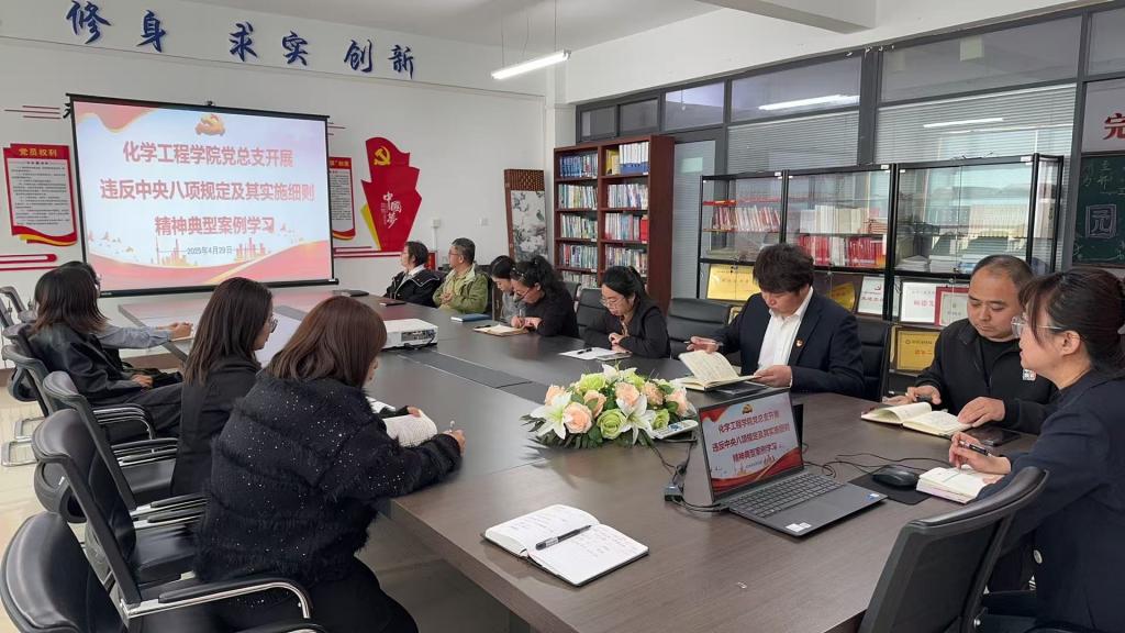2025年4月29日,化学工程学院党总支积极响应党的号召,全面贯彻落实中央关于全面从严治党的要求,组织全体党员深入开展了违反中央八项规定及其实施细则精神的典型案例学习活动。本次活动旨在进一步强化党员干部的纪律意识,筑牢廉洁自律的思想防线,确保党的纪律规矩在学院各项工作中得到严格遵守和执行。