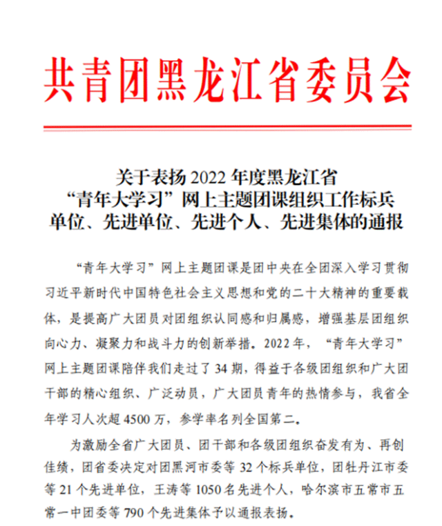 近日,由共青团黑龙江省委员会组织开展的“2022年度黑龙江省‘青年大学习’网上主题团课组织工作‘先进个人’‘先进集体’评选结果揭晓现结果已公布,欧博官网团委荣获多项奖项,取得了优异的成绩。