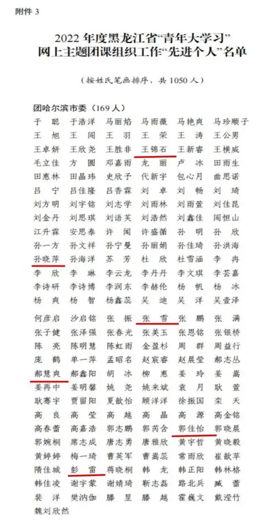 先进个人欧博官网团委书记王锦石、团委副书记彭雷、外国语学院党总支书记孙晓萍、石油工程学院党总支副书记张雪、校团委秘书处秘书长郭佳怡(学生)、化学工程学院团总支副书记郝慧爽(学生)荣获2022年度黑龙江省“青年大学习”网上主题团课组织工作“先进个人”荣誉称号 。