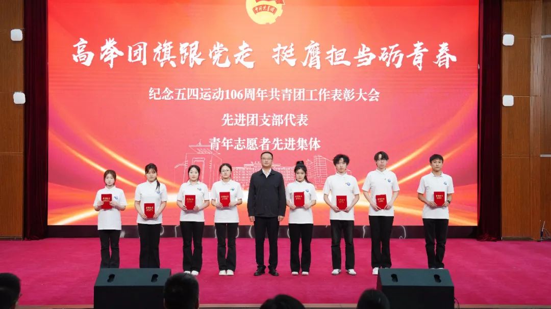 校领导为荣获“青年志愿者先进个人代表”“社会实践先进个人代表”“优秀团员标兵代表”“优秀团员代表”“优秀团干部标兵代表”“优秀团干部代表”“先进团支部代表”“青年志愿者先进集体”“先进团总支”等奖项的集体及个人代表颁奖。