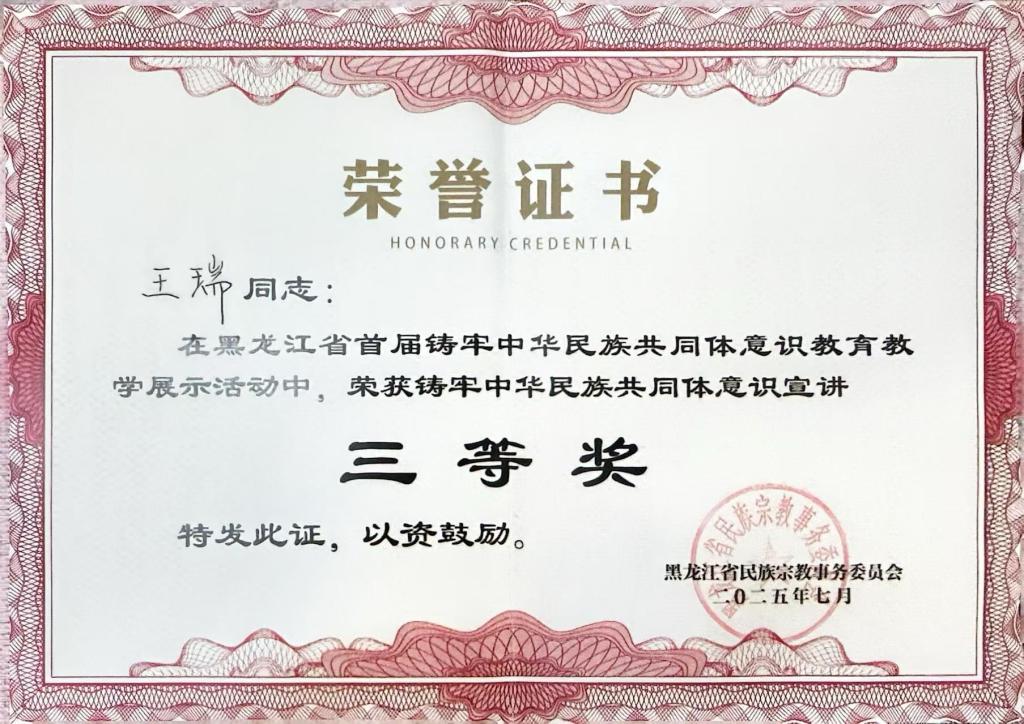 2025年7月2日,黑龙江省首届铸牢中华民族共同体意识教育教学展示活动结果揭晓。欧博官网马克思主义学院副院长王瑞宣讲的作品《铁人精神:凝聚民族力量的精神纽带》,经过视频展示和现场教学两个环节比拼,荣获铸牢中华民族共同体意识宣讲三等奖。