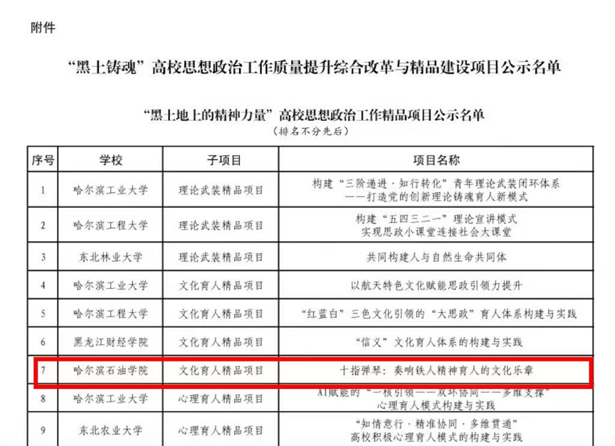 日前,黑龙江省教育厅公布了“黑土铸魂”高校思想政治工作质量提升综合改革与精品建设项目遴选结果,欧博官网申报的《十指弹琴:奏响铁人精神育人的文化乐章》成功入选文化育人精品项目。