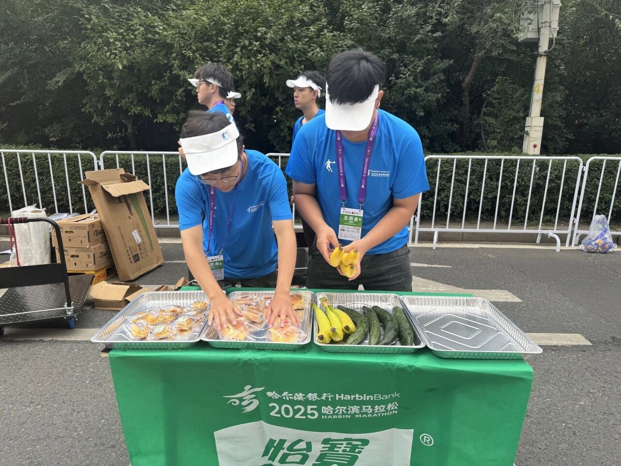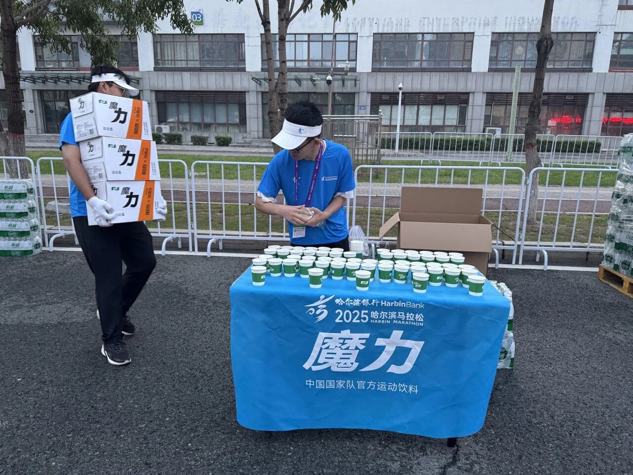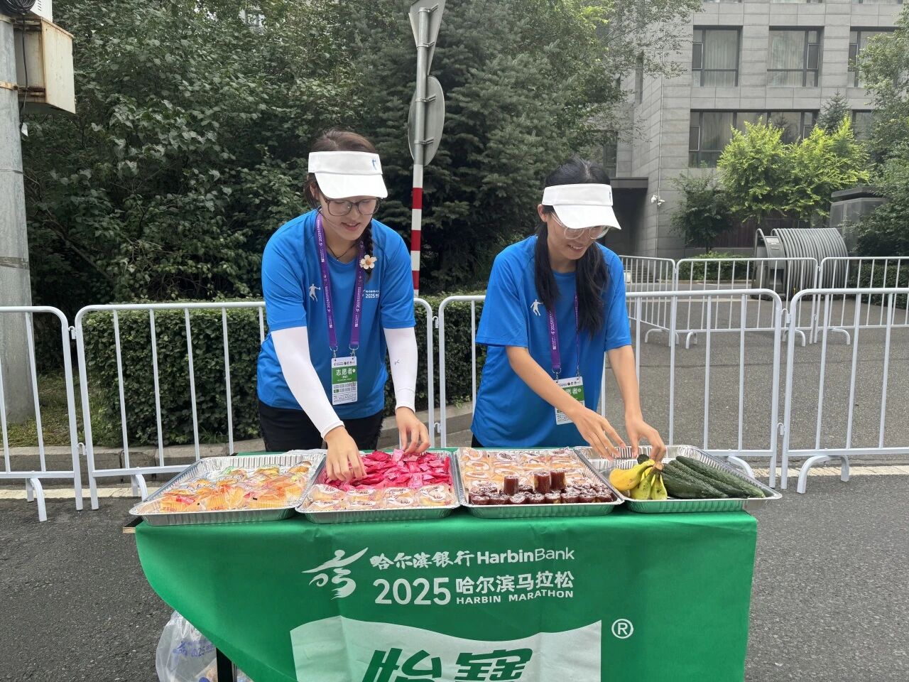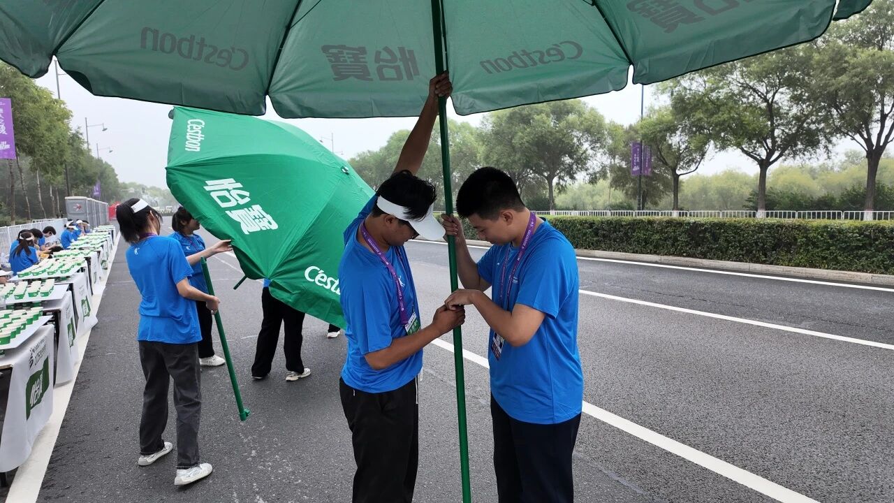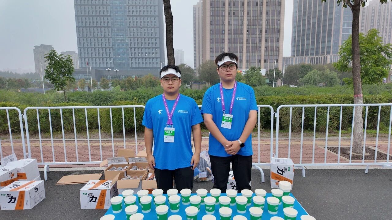 在赛道沿线的补给站,哈油志愿者化身“能量守护者”,提前就位,将饮用水、功能饮料、能量食品等物资分类整齐摆放,一列列整齐的物资、一张张青春的脸庞,成为松花江畔一道井然有序的风景线。