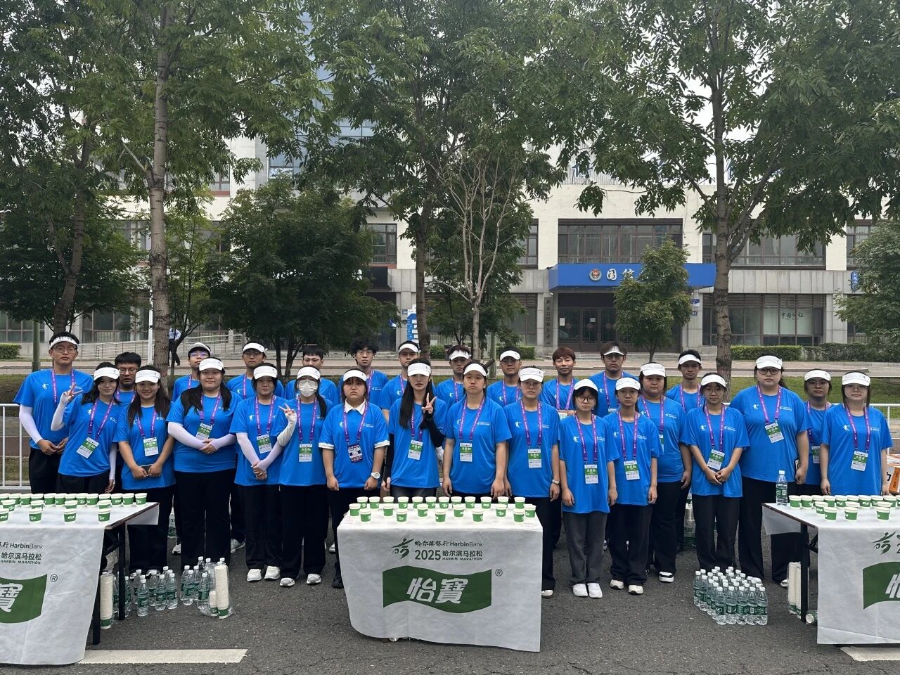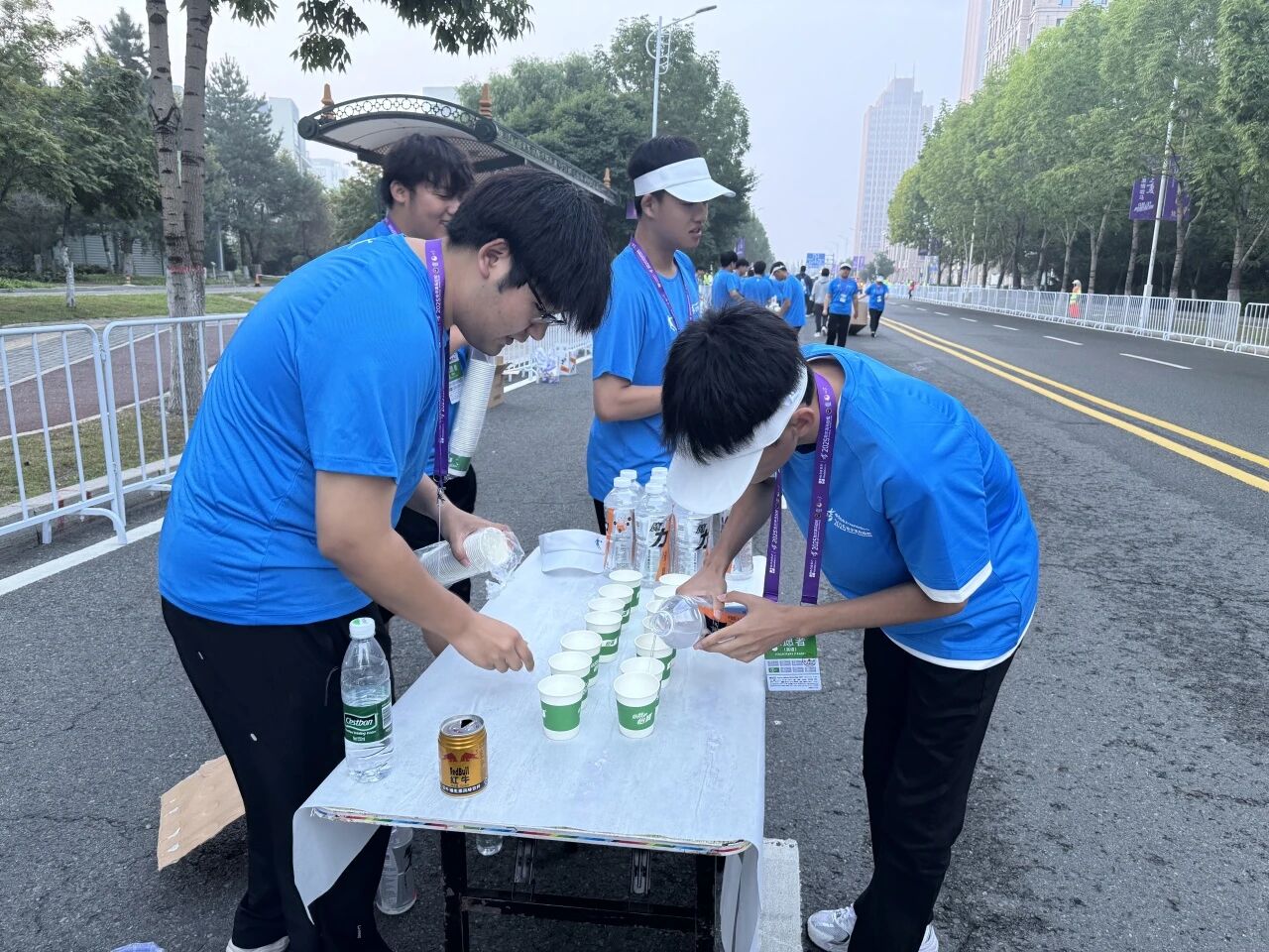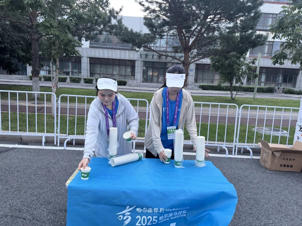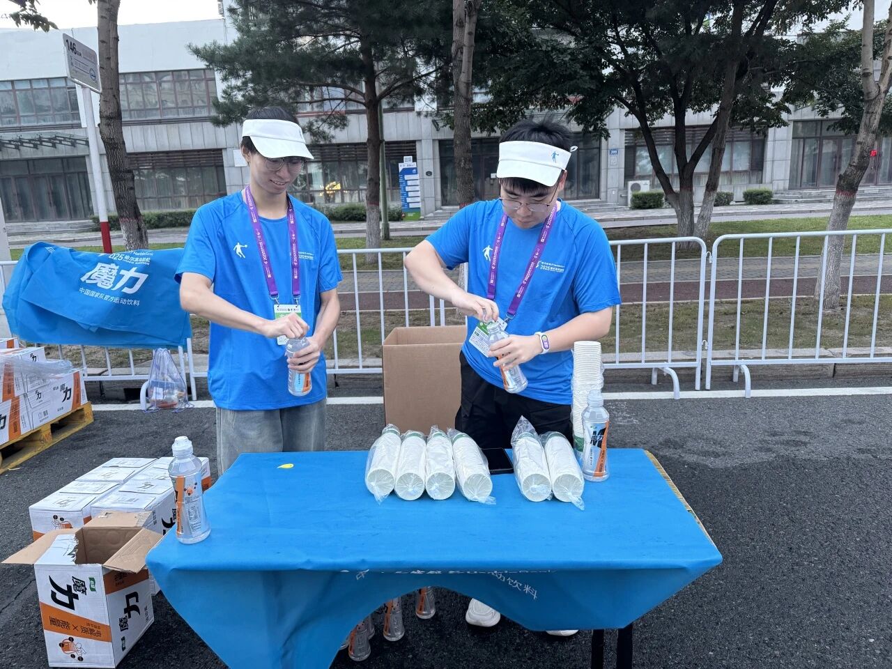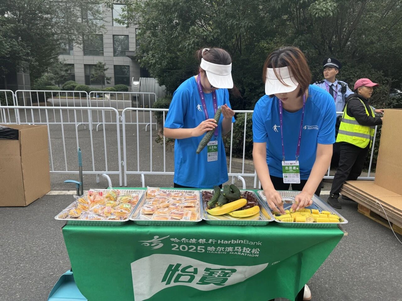 在赛道沿线的补给站,哈油志愿者化身“能量守护者”,提前就位,将饮用水、功能饮料、能量食品等物资分类整齐摆放,一列列整齐的物资、一张张青春的脸庞,成为松花江畔一道井然有序的风景线。