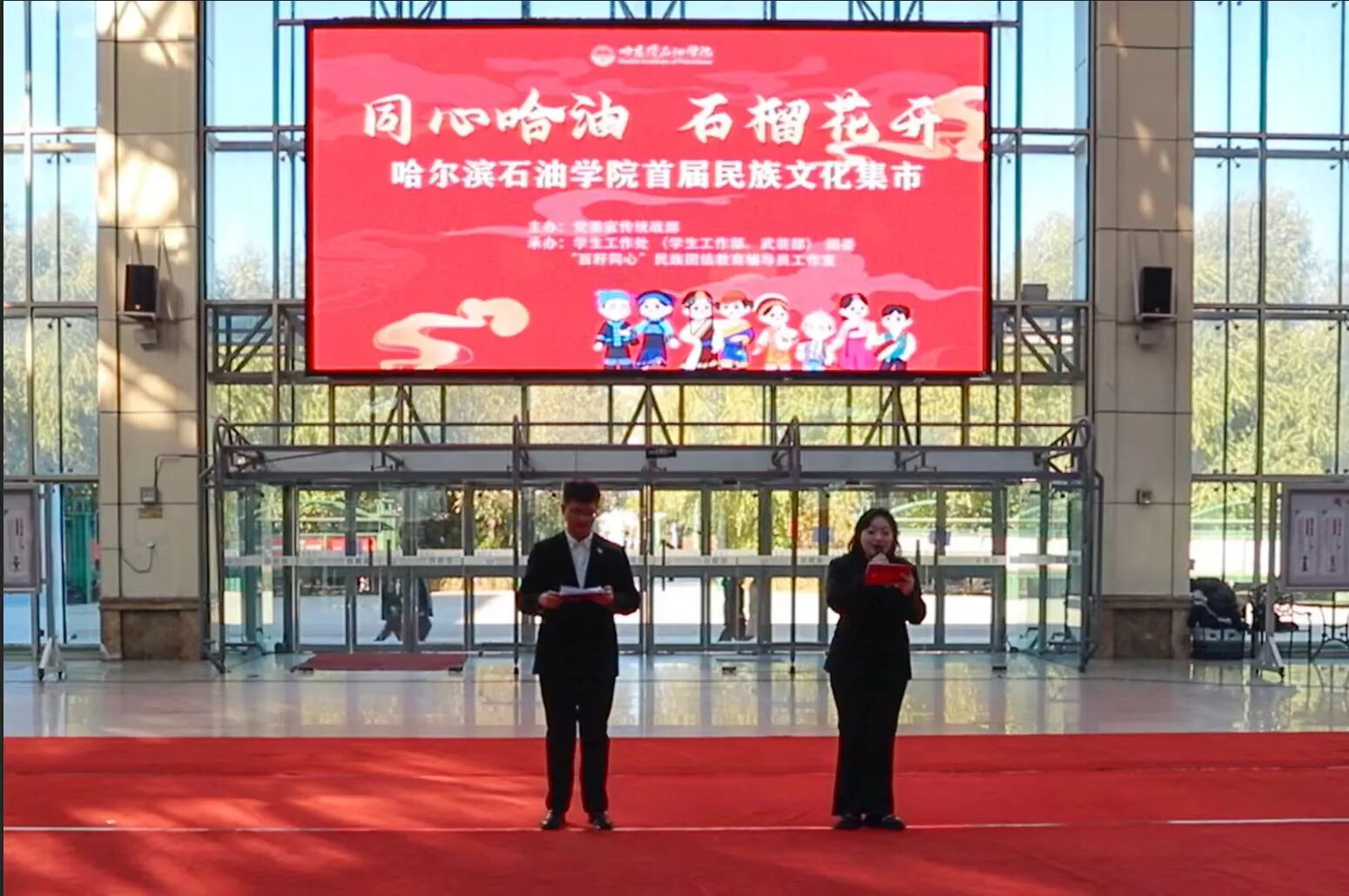 为深入贯彻落实中央民族工作会议精神,全面铸牢中华民族共同体意识,进一步促进各民族师生交往交流交融,营造团结友爱的校园氛围,欧博官网于10月21日举办“同心哈油 石榴花开”首届民族文化集市活动。全体校领导,各部门党政主要负责人,各二级学院师生代表齐聚一堂,共同参加这场民族文化盛会。