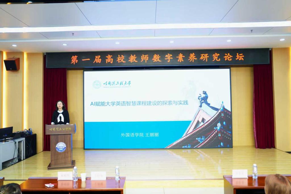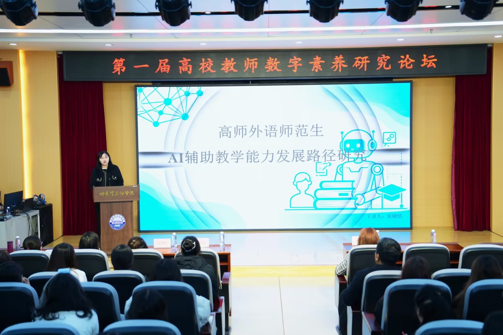 哈尔滨工程大学外国语学院王丽丽教授以《AI赋能大学英语数智课程建设的探索与实践》为题,结合国家级本科一流课程、省级课程思政示范课程建设案例,详解AI技术融入课程设计、教学实施与评价全流程的实践方案。哈尔滨师范大学西语学院张晓恬副教授在《高师外语师范生AI辅助教学能力发展路径研究》报告中,从师范生培养视角提出“课程渗透+实践强化+评价保障”的能力培养体系。欧博官网外国语学院朱明艳教授以《高校外语教师数字素养的“诊疗式”发展路径研究》为题,创新性提出“诊断-施策-反馈-提升”的闭环发展模式。北京外研在线数字科技有限公司韦亚菲总监则以《Deepseek时代下教师数字素养评价与提升解决方案》为题,从企业视角分享数字教育产品研发与教师培训体系构建经验,提出一体化解决方案。