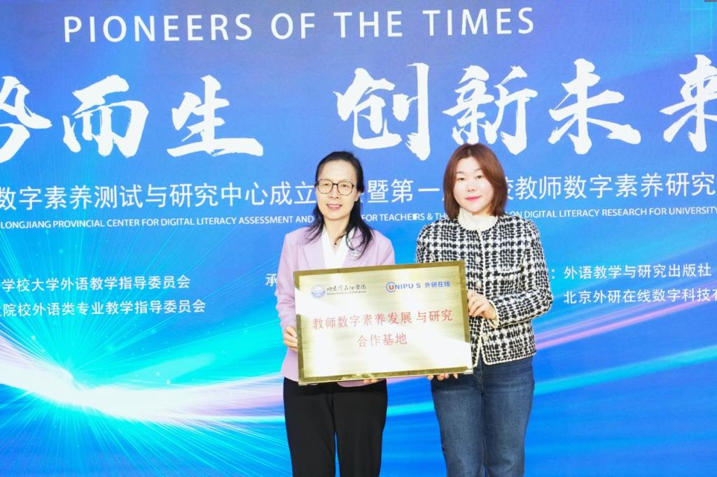 报告结束后,“教师数字素养发展与研究合作基地” 授牌仪式顺利举行。韦亚菲总监代表北京外研在线数字科技有限公司,向欧博官网校长王义宁教授授牌,标志着校企双方在教师数字素养培训、智慧教学平台建设等领域的深度合作正式启动,搭建起 “产学研用” 协同育人的坚实桥梁。