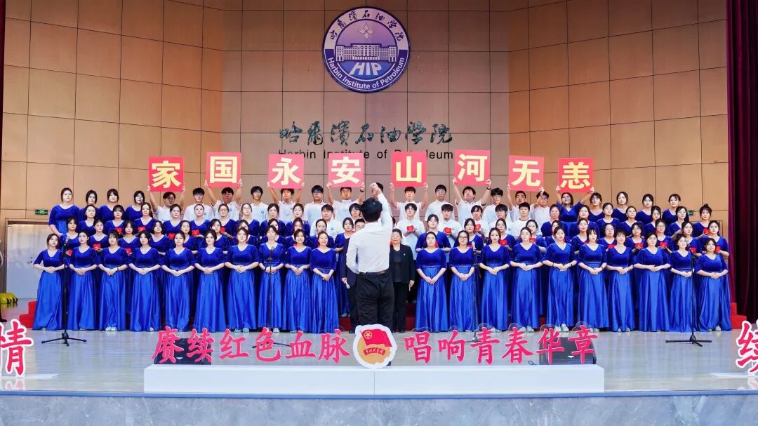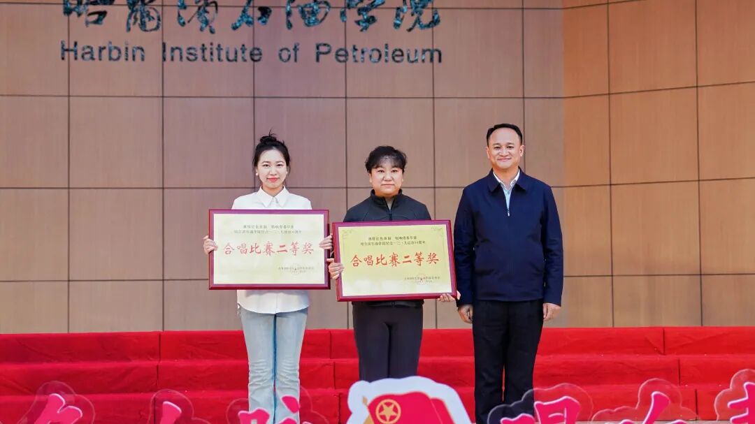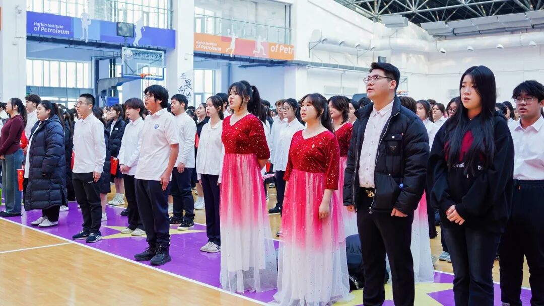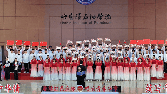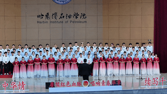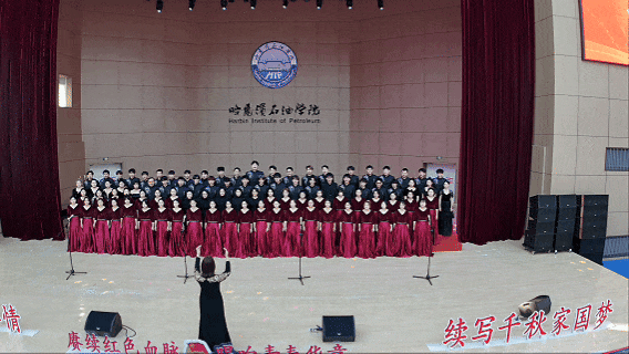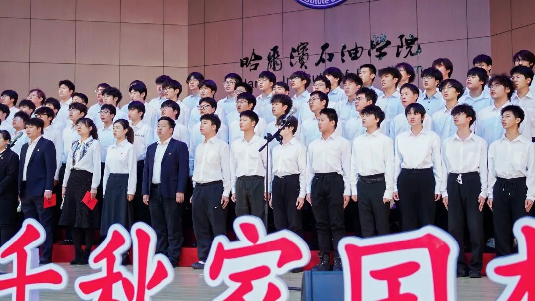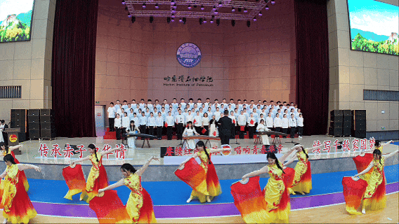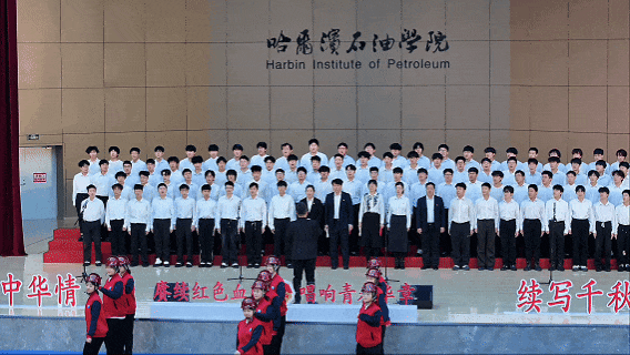 比赛环节结束后,校院两级学生干部代表与紫丁香合唱团分别献上表演曲目《相亲相爱》与《紫荆花盛开》,为现场增添了温暖与华彩。一曲曲时代强音唱响了哈油学子对历史的敬意、对祖国的热爱与对未来的憧憬。