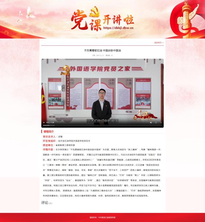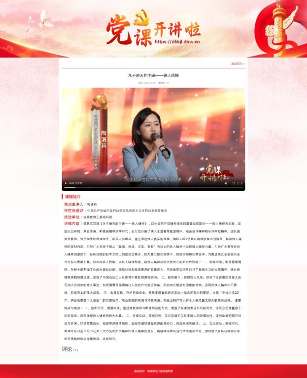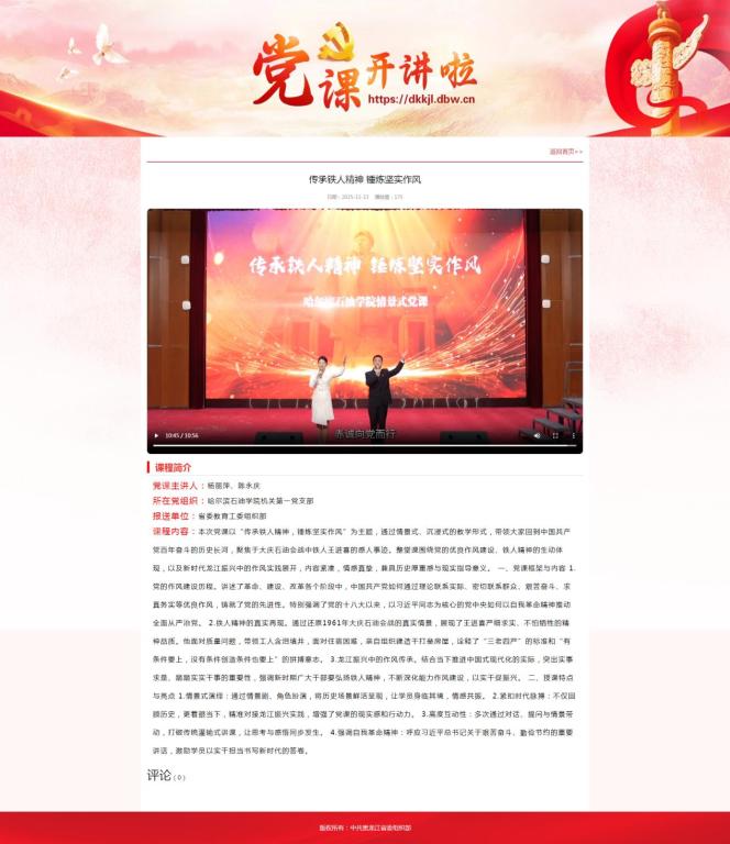 机关第一党支部与马克思主义学院党总支联合推出的《传承铁人精神 锤炼坚实作风》,采用沉浸式情景剧形式,使作风建设宣讲入脑入心。