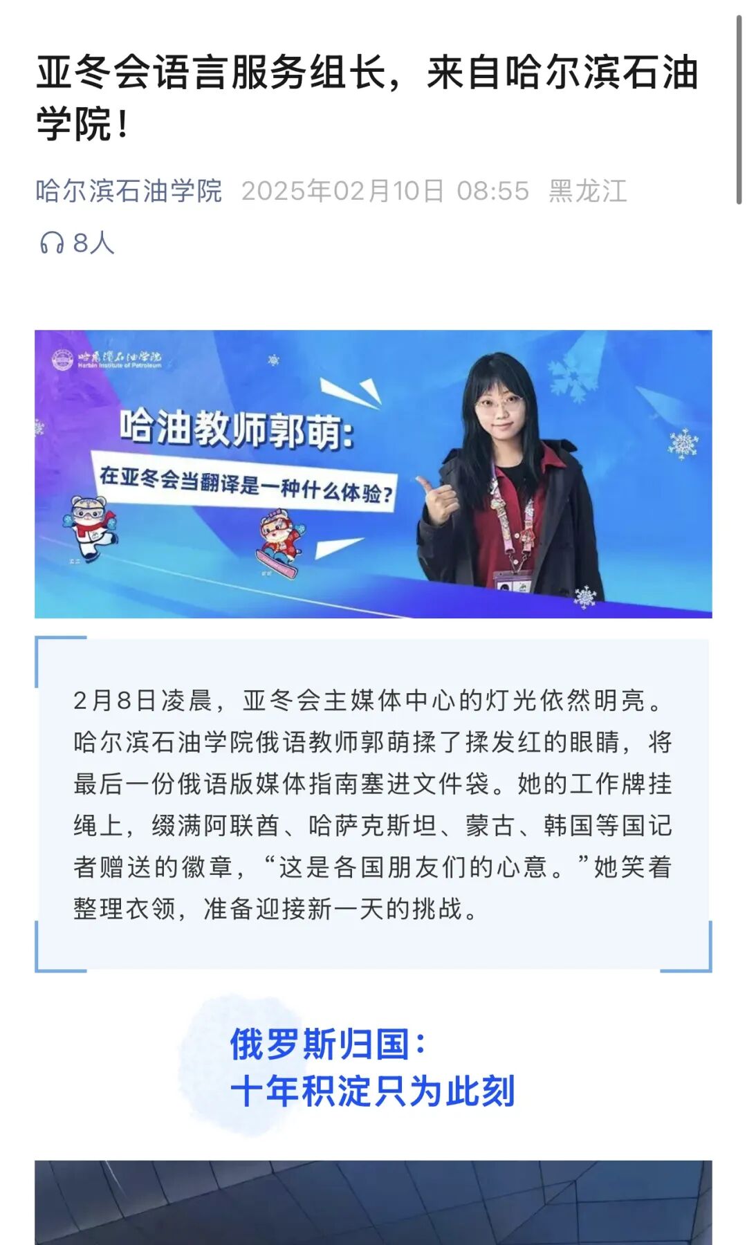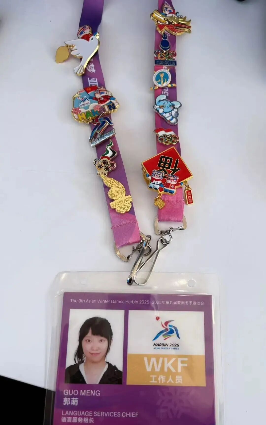 自2025年1月31日上岗,郭萌每日工作超12小时,最长连续奋战19小时,坚守咨询台,为各国记者提供英语、俄语语言服务以及协助其他交通、餐饮、采风等小组全链条服务。她积极与团队成员紧密配合,充分发挥自身优势,激发团队整体活力,推动志愿服务工作高效开展。在主媒体中心服务的整个过程中,她与小组团队共计发放媒体指南两百余本,服务境内外人次三百余次。郭萌的工作牌挂绳挂满了各国记者赠送的徽章,成为了“微缩联合国”。