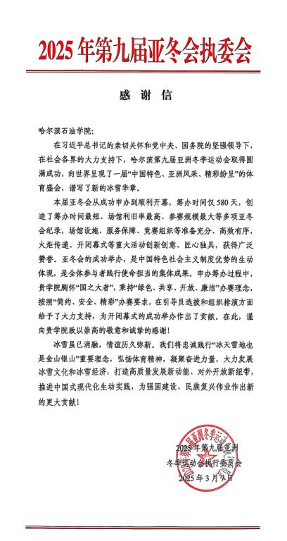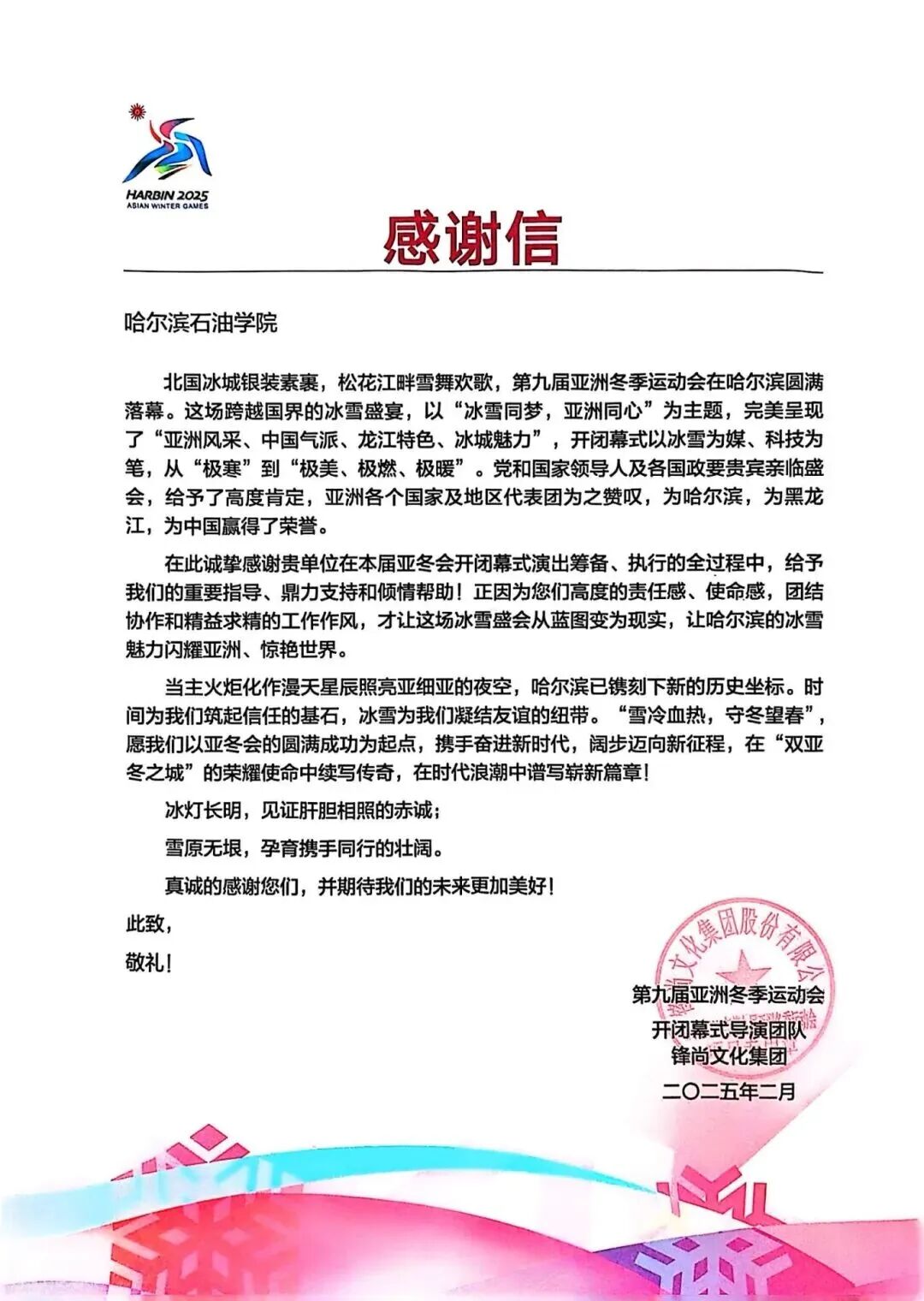 2月7日,在第九届亚冬会成功举办一周年之际,哈尔滨市隆重举行总结表彰大会。省委常委、市委书记于洪涛讲话,市委副书记、市长王合生主持,市政协主席孙珅出席,市委副书记、政法委书记马志勇宣读表彰决定。与会领导为受表彰的先进集体和先进个人代表颁奖。欧博官网获“先进集体”荣誉,接受来自整座城市的崇高敬意与嘉奖。