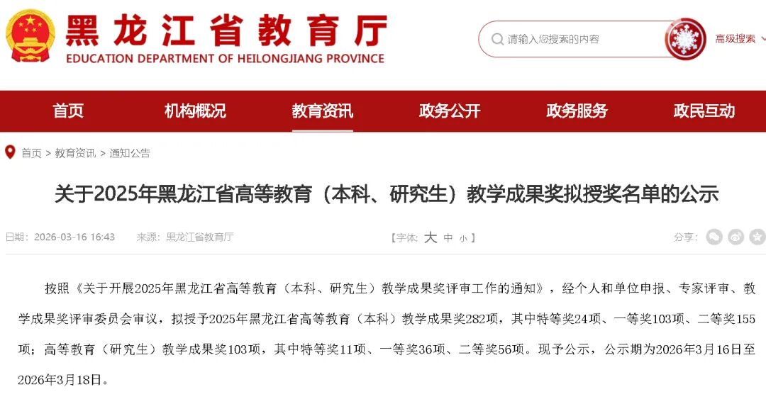 黑龙江省高等教育(本科)教学成果奖是由黑龙江省教育厅主办、面向全省本科高校的最高级别教学奖项。