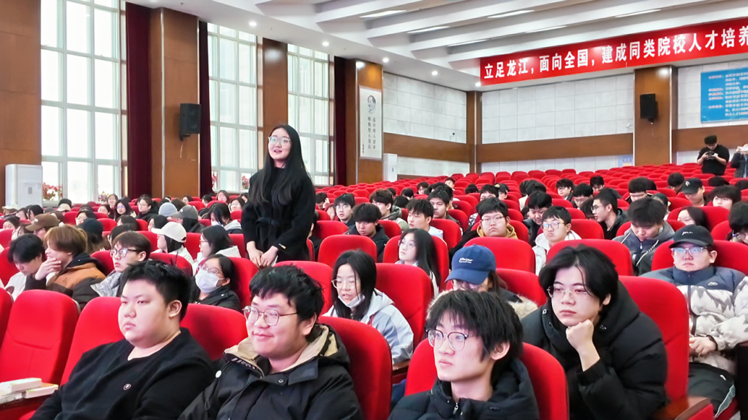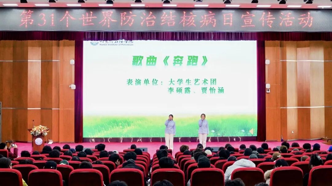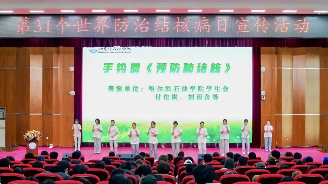 大学生艺术团李硕露、贾怡涵带来的改编歌曲《奔跑》,校学生会付佳祺、刘雨含等表演《预防肺结核手势舞》,用青春旋律传递健康力量;哈尔滨市胸科医院副主任医师阮文秋作结核病防治科普讲座,结合大学生群体特点,深入讲解传播途径、常见症状及治疗原则,强调宿舍通风、增强免疫力等校园预防要点;松北区疾控中心传控与应急科副科长林千山组织的有奖问答,激发学生参与热情