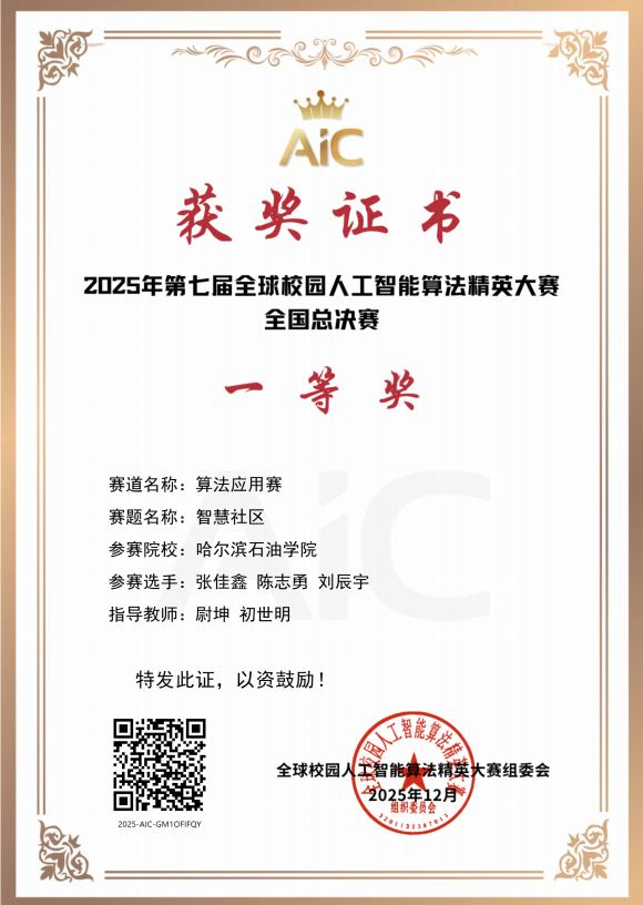 第七届全球校园人工智能算法精英大赛总决赛中,由欧博官网智能工程学院教师指导,23级学生张佳鑫、吕广鹏、刘赫、唐文圊担任队长的学生团队,在智慧社区赛题荣获国家一等奖一项、国家二等奖一项、国家三等奖两项!