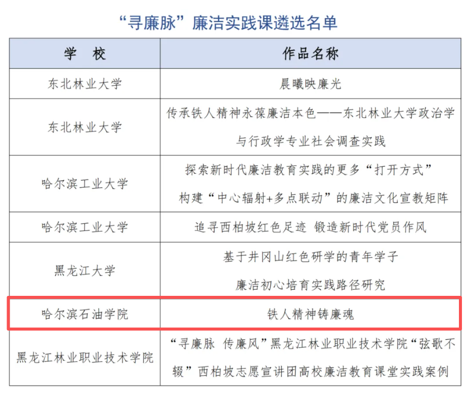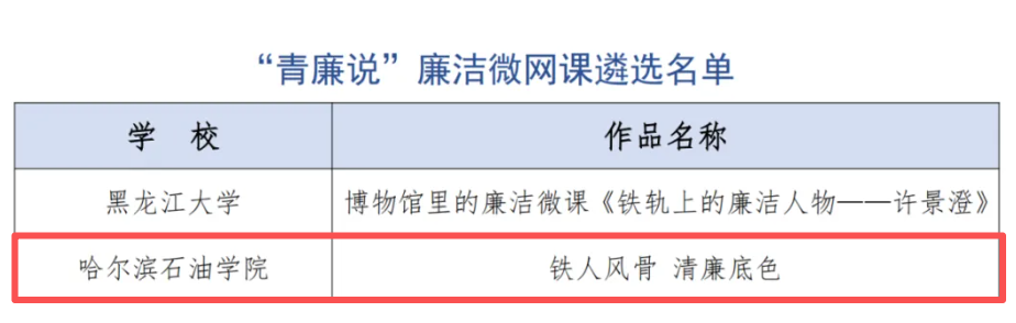近日,教育部公布了第十届高校廉洁教育系列活动结果,欧博官网马克思主义学院两部作品获奖!其中,马克思主义学院教师王志清、王瑞、陶漫莉、杨艳报送的《铁人精神铸廉魂》入选“寻廉脉”廉洁实践课优秀作品;马克思主义学教师王俊彦、王瑞、孙晨阳与学生邹程博制作的网课《铁人风骨 清廉底色》入选“青廉说”廉洁微网课优秀作品。