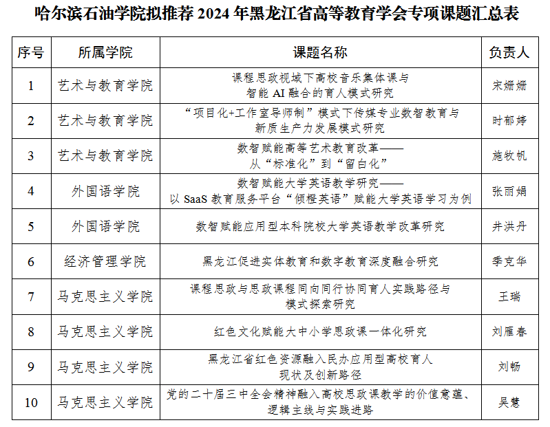 根据黑龙江省教育厅《关于开展“党的二十届三中全会、2024年全国教育大会专项课题”申报工作的通知》要求,经个人申报、学院推荐、学校评审,拟推荐以下10项项目参加省级项目的评选。现将结果予以公示。