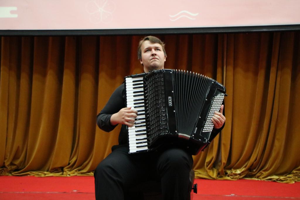 音乐会在贝多芬的《A大调主题变奏曲》中拉开了帷幕,激昂的旋律、精彩的演绎,博得了在场师生的阵阵掌声。此次音乐会共为师生献上了2首钢琴演奏曲目和6首手风琴演奏作品。其中,由俄罗斯柴可夫斯基的《谐谑曲》将音乐会推向高潮。整个会场洋溢着浓厚的艺术气息,伴随着一曲以古典浪漫为主题的变奏曲《黑眼睛》,音乐会在全场热烈的掌声中落下了帷幕。