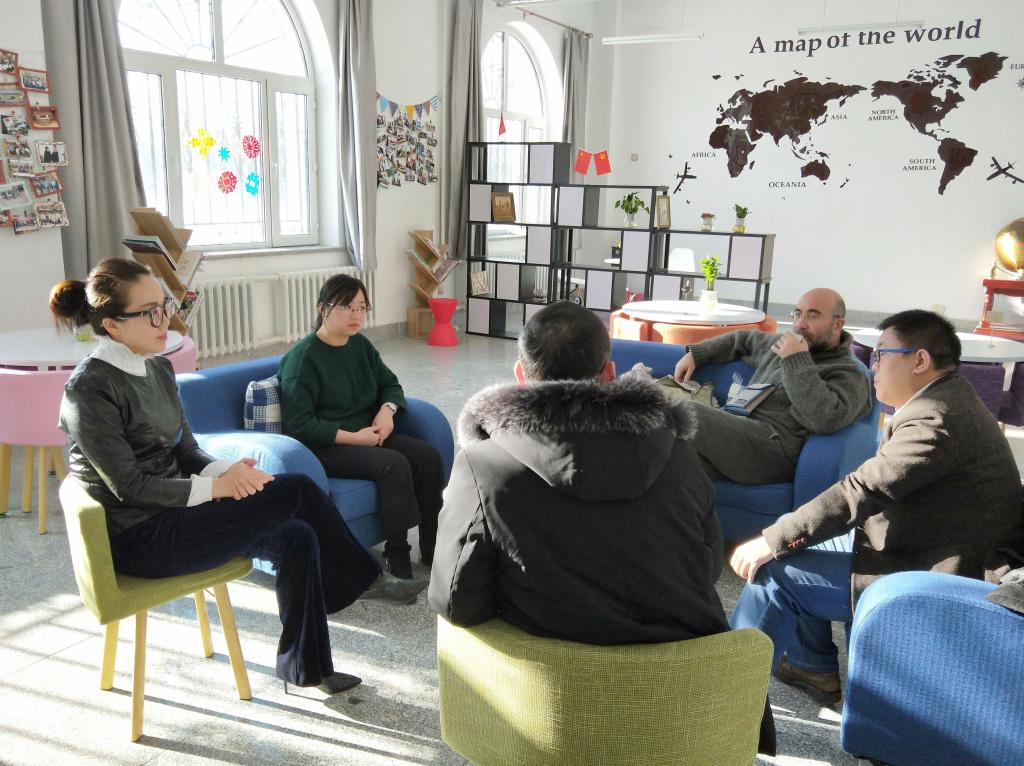 12月28日,意中文化教育交流协会会长、那不勒斯美术学院驻中国办事处主任王云涛博士、那不勒斯美术学院摄影系主任BARONE ANIELLO教授、意中文化教育交流协会秘书长曲富有一行来访欧博官网,洽谈两校合作办学事宜。欧博官网副校长冯研、国际教育学院院长周瑞、艺术学院副院长花瑞洁接待了王云涛博士等一行的到来。