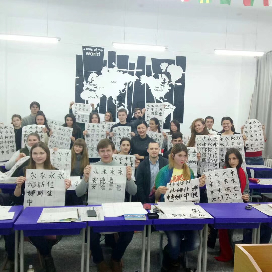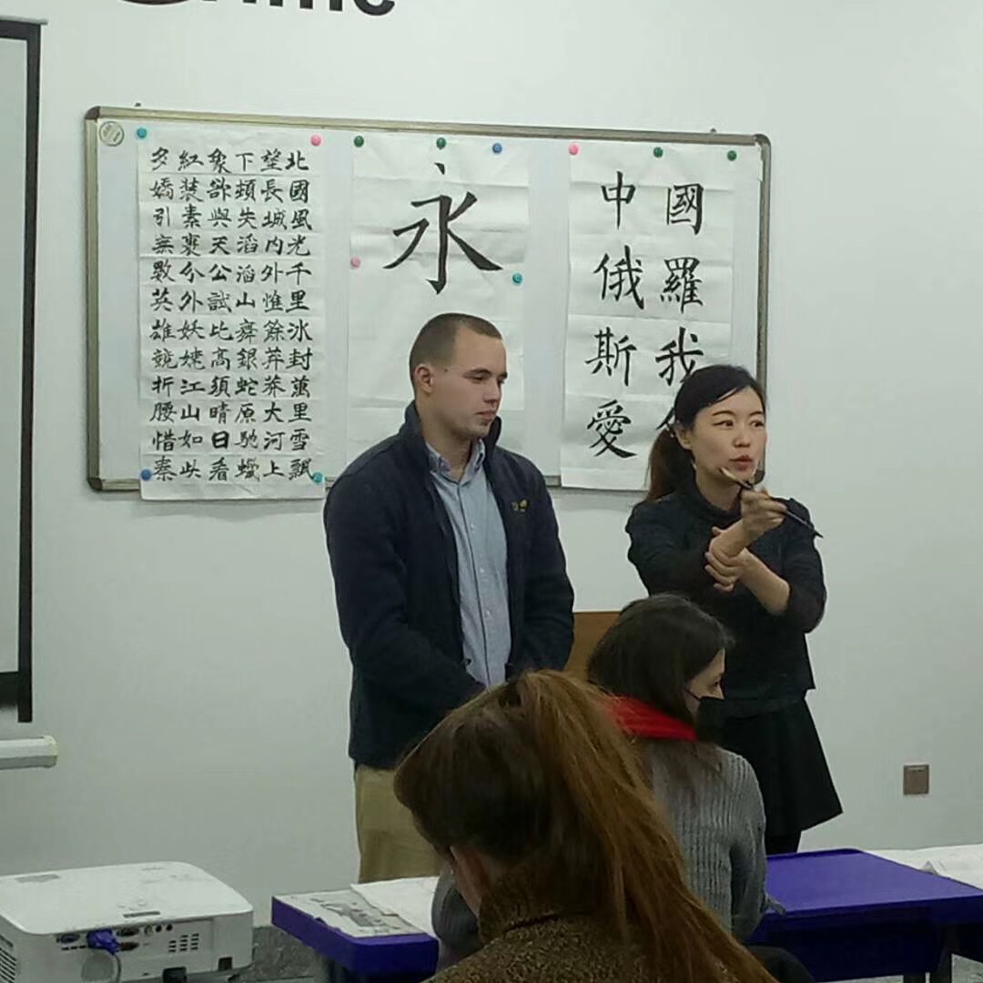 10月中旬,庆祝中国共产党第十九次人民代表大会胜利召开之际,欧博官网国际教育学院组织学生开展“书法活动”,本次活动邀请到了土木工程学院赵宇老师及热爱书法的中国学生一同来参加。首先,赵老师给俄罗斯学生介绍了中国书法这种中国特有的传统艺术的发展历程、书写形式、书写规则及软笔书法的主要类别。现代书本中字体多是楷体字,楷体字看起来规范、工整,因此初学毛笔字先从楷书字体学起。在介绍完写毛笔字必备的文书工具文房四宝——笔、墨、纸、砚后,俄罗斯学生纷纷拿起毛笔,在赵老师的示范下,握着毛笔练习静心、磨墨、悬腕、运笔。赵老师示范着书写了“中俄友好”、“中俄友谊”、“我爱中国”等让俄罗斯学生临摹,中国学生对留学生进行一对一辅导,帮助他们正确的掌握书写的方法。
