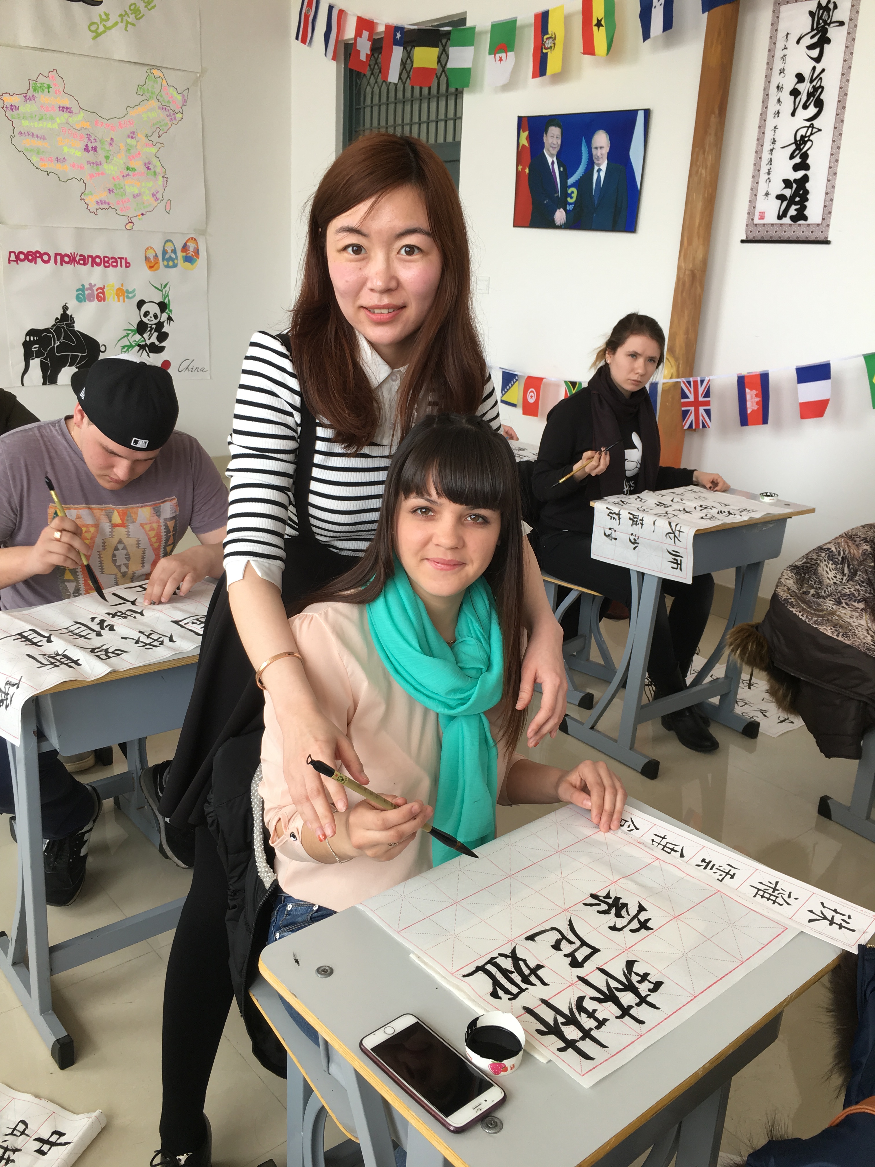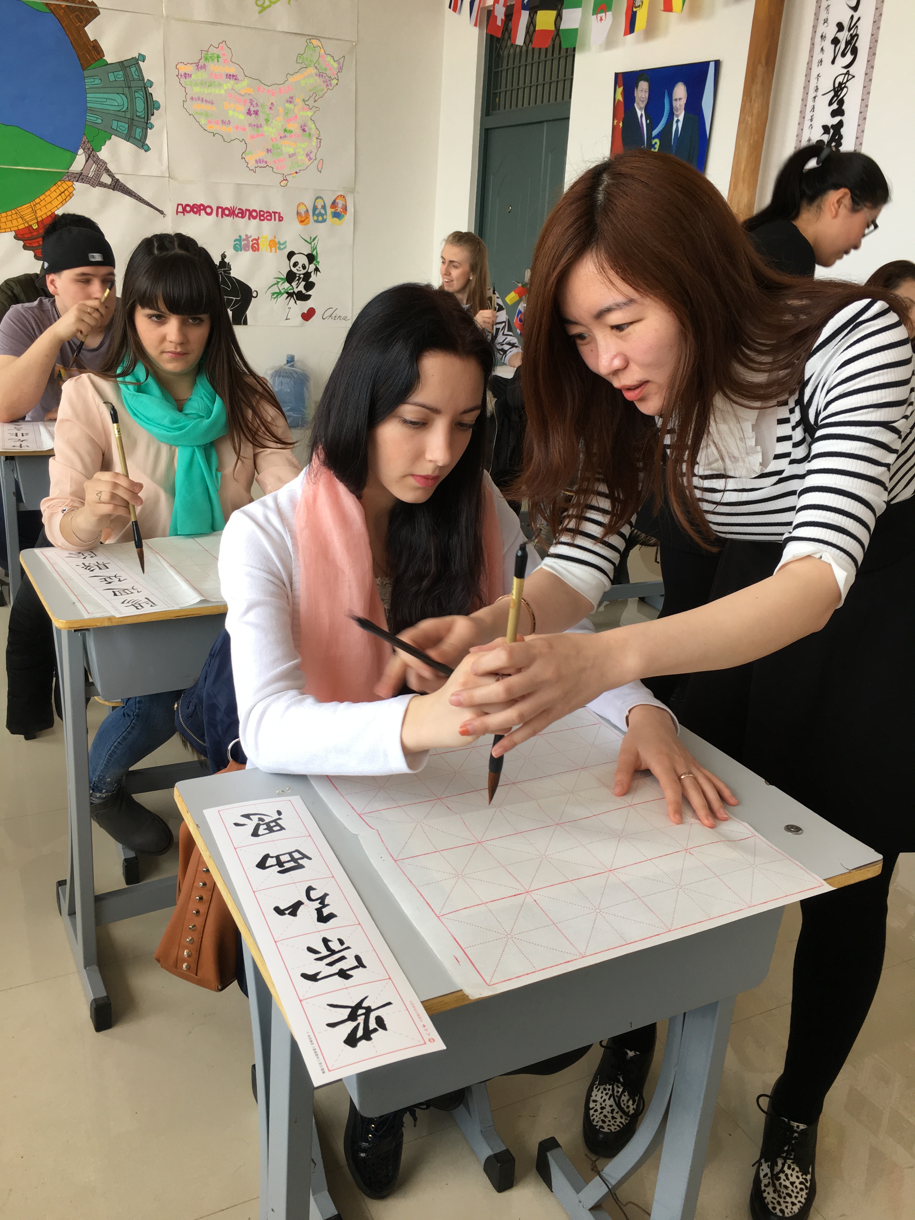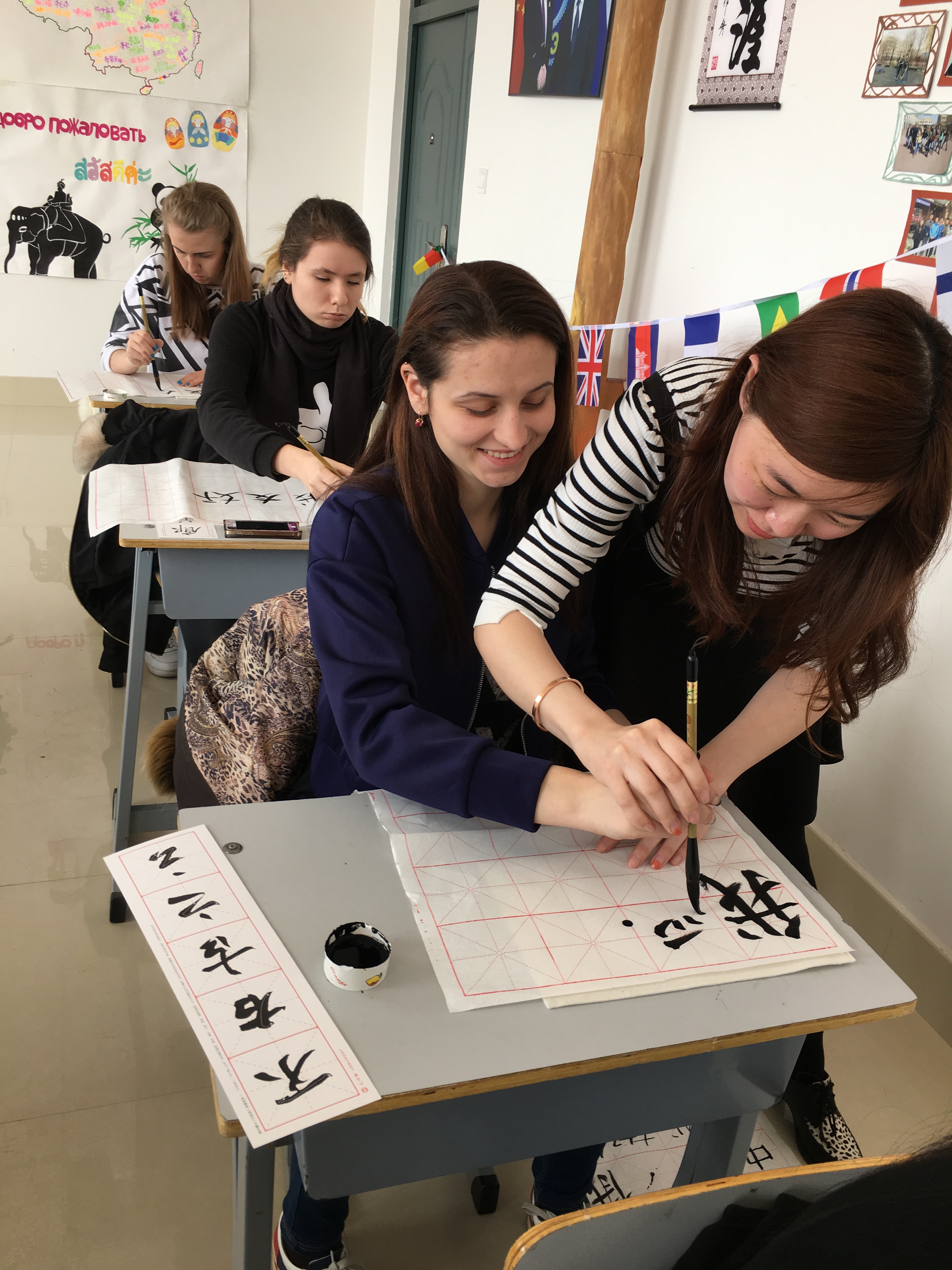 4月8日,俄罗斯远东联邦大学乌苏里斯克分校学生来到欧博官网国际教育学院“飞翔俱乐部”活动室参观,感受中国传统文化魅力,学习书法。同时,我们俱乐部还荣幸地邀请到了土木工程学院书法爱好者赵宇老师及她的学生一同来参加本次书法学习活动。首先,赵老师声情并茂地给俄罗斯学生介绍了中国书法这种中国特有的传统艺术的发展历程、书写形式、书写规则及软笔书法的主要类别。现代书本中字体多是楷体字,楷体字看起来规范,工整,因此初学毛笔字先从楷书字体学起。在介绍完写毛笔字必备的文书工具文房四宝——笔、墨、纸、砚后,俄罗斯学生纷纷拿起毛笔,在赵老师的示范下,握着毛笔练习静心、磨墨、悬腕、运笔。赵老师和她的学生示范着书写了“中俄友好”、“中俄友谊”、“我爱中国”等让俄罗斯学生临摹。