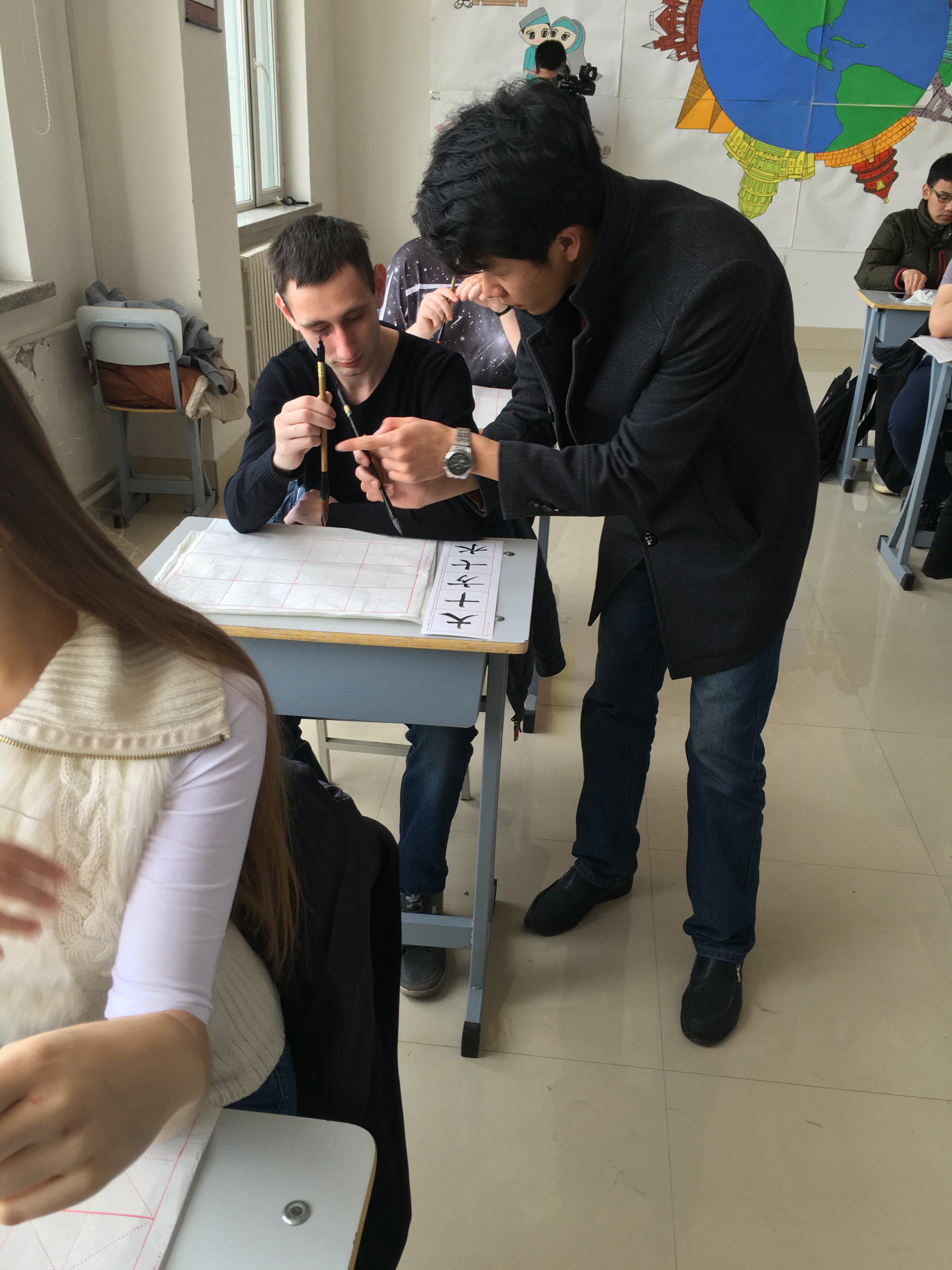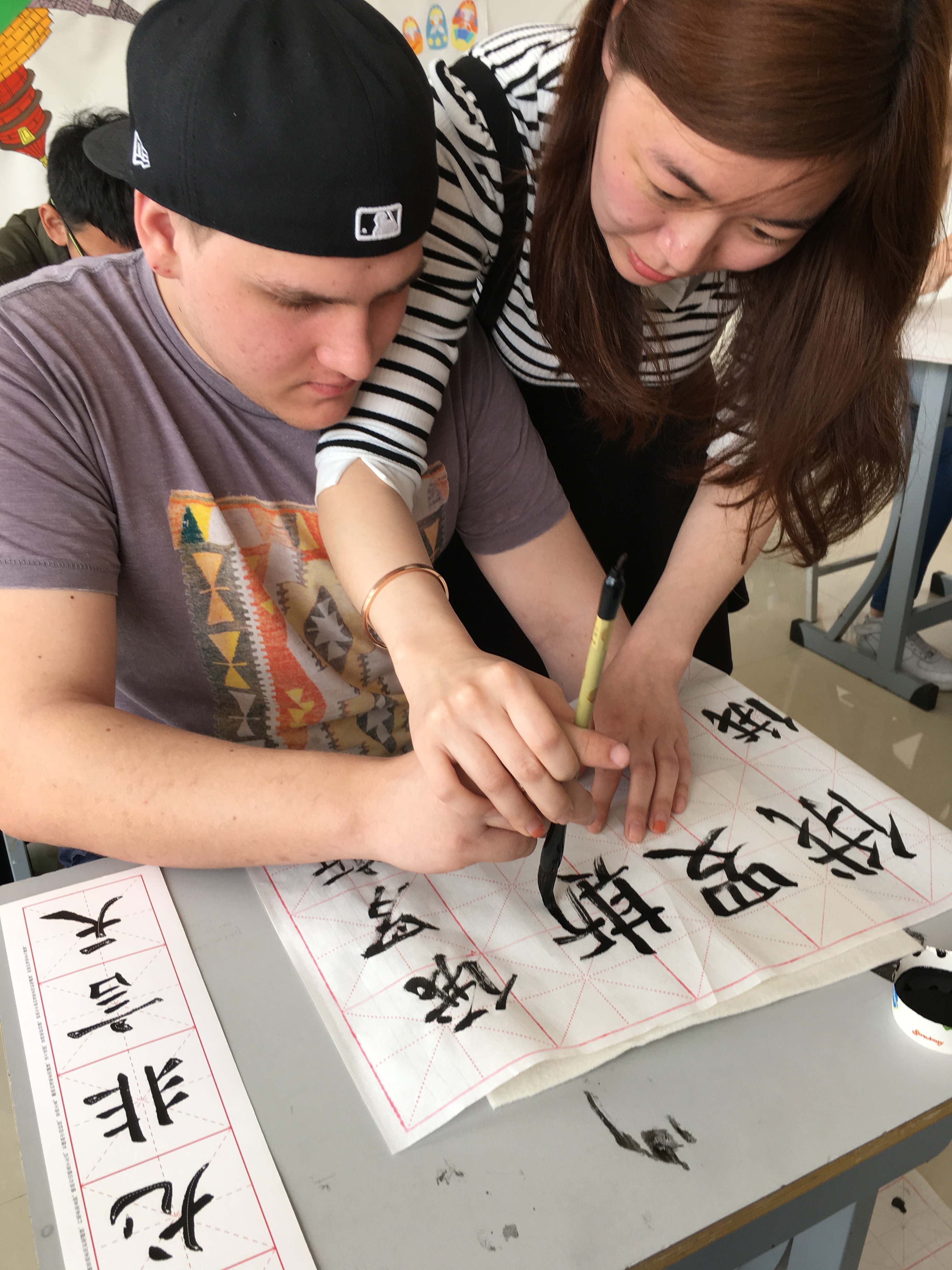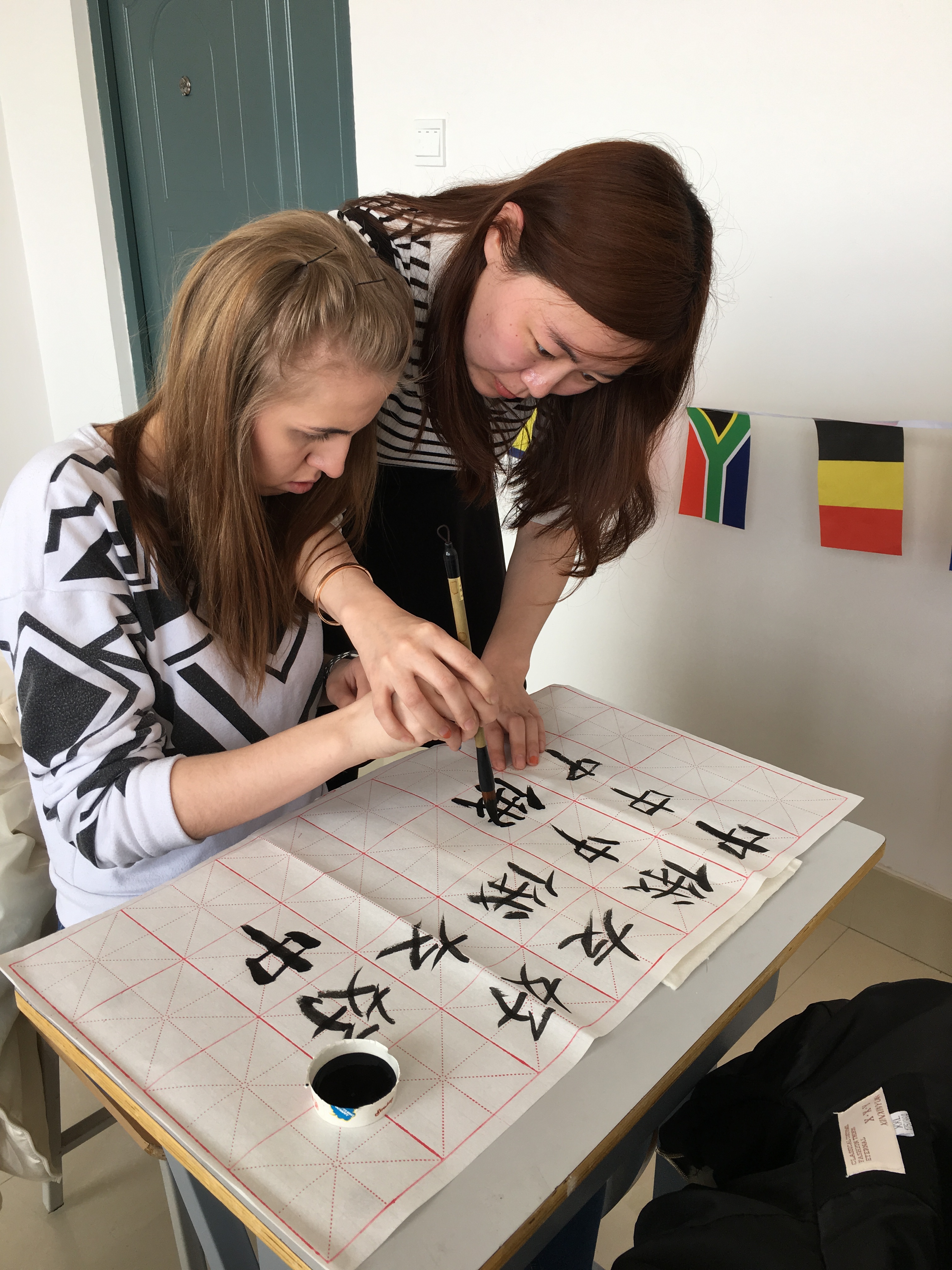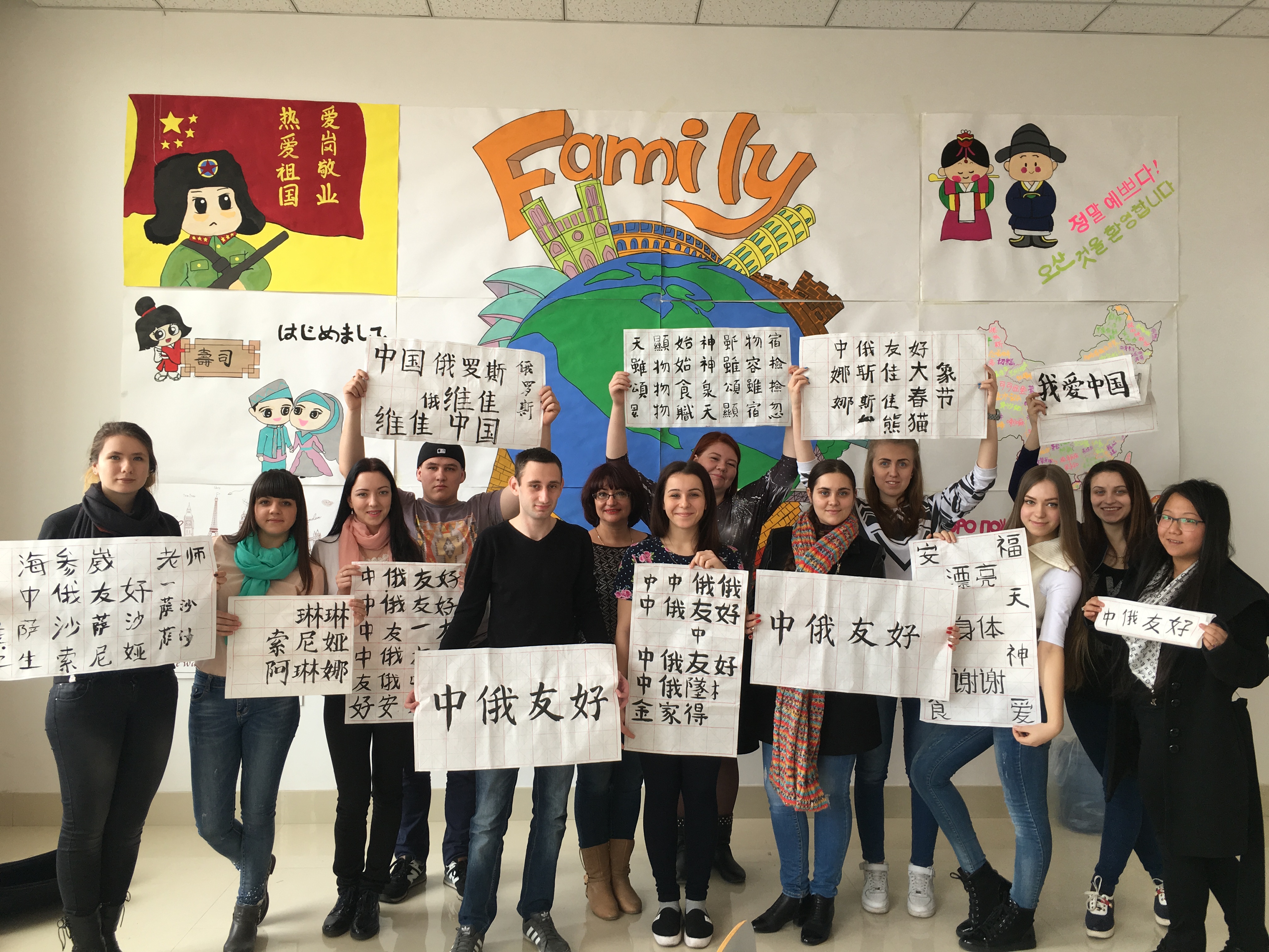 4月8日,俄罗斯远东联邦大学乌苏里斯克分校学生来到欧博官网国际教育学院“飞翔俱乐部”活动室参观,感受中国传统文化魅力,学习书法。同时,我们俱乐部还荣幸地邀请到了土木工程学院书法爱好者赵宇老师及她的学生一同来参加本次书法学习活动。首先,赵老师声情并茂地给俄罗斯学生介绍了中国书法这种中国特有的传统艺术的发展历程、书写形式、书写规则及软笔书法的主要类别。现代书本中字体多是楷体字,楷体字看起来规范,工整,因此初学毛笔字先从楷书字体学起。在介绍完写毛笔字必备的文书工具文房四宝——笔、墨、纸、砚后,俄罗斯学生纷纷拿起毛笔,在赵老师的示范下,握着毛笔练习静心、磨墨、悬腕、运笔。赵老师和她的学生示范着书写了“中俄友好”、“中俄友谊”、“我爱中国”等让俄罗斯学生临摹。