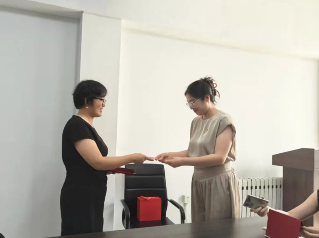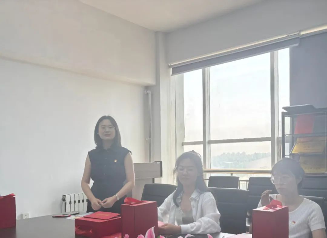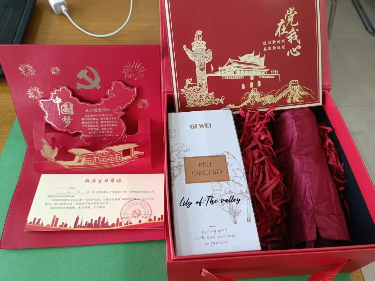 集体过“政治生日”环节将活动氛围推向高潮。支部书记崔艳为党员们一一发放政治生日贺卡,精美的贺卡上印着入党誓词与温馨寄语,承载着党组织对党员的关怀与祝福。随后,党总支书记刘强为党员们送上精心准备的生日礼物,这份礼物饱含着党组织对党员的深情厚意。