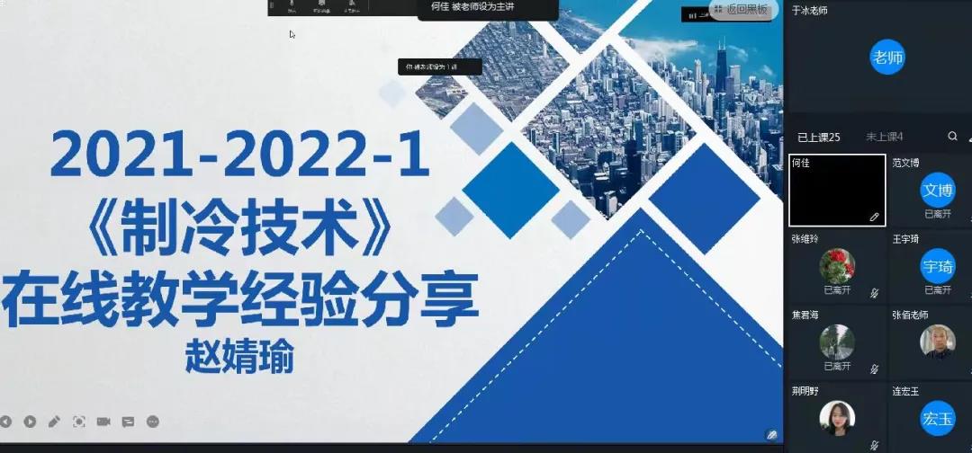 赵婧瑜老师分享自己的线上教学经验,首先精心制作的PPT课件内容丰富,图文并茂,动画生动,通过把制冷装置复杂的部件结构图和工作原理以实物图片、动画的形式展现出来,对流体的流动方向,复杂结构部件的移动,压力、温度等参数的变化表现直观,带入感强。容易让学生理解并且印象深刻,便于强化记忆,收到良好的教学效果。