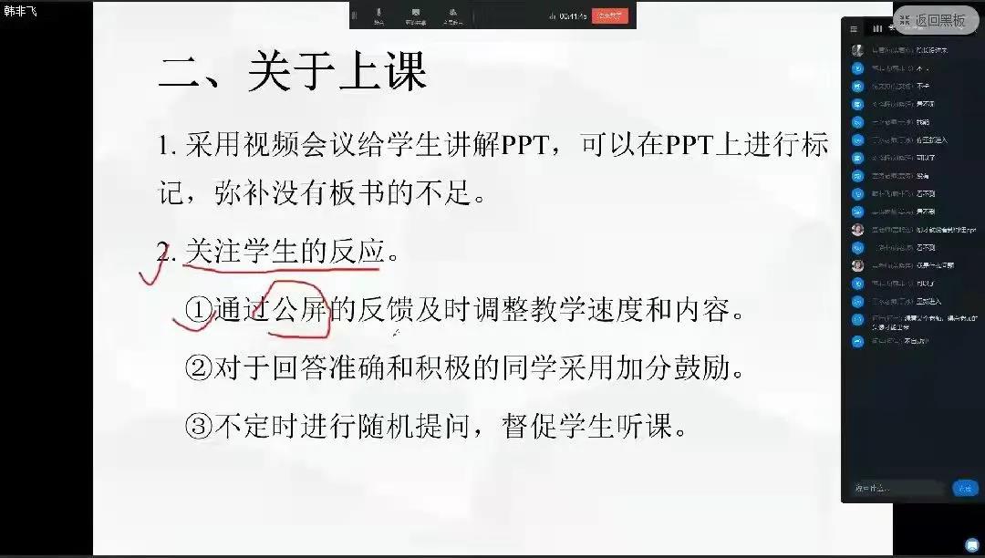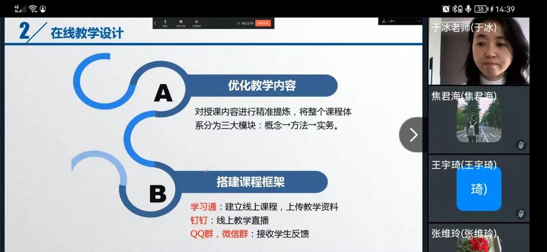 首先,教学副院长于冰对本轮线上教学进行简要总结,其次四位学院骨干教师何佳,赵婧瑜,韩非飞,刘晓晖依次发言,分享自己对于线上教学的经验。