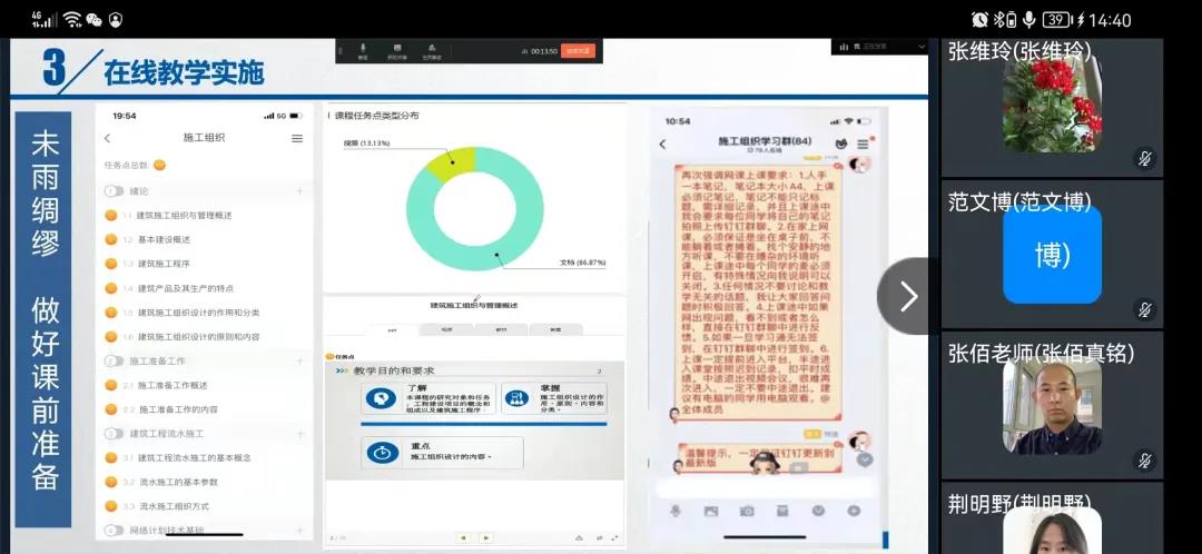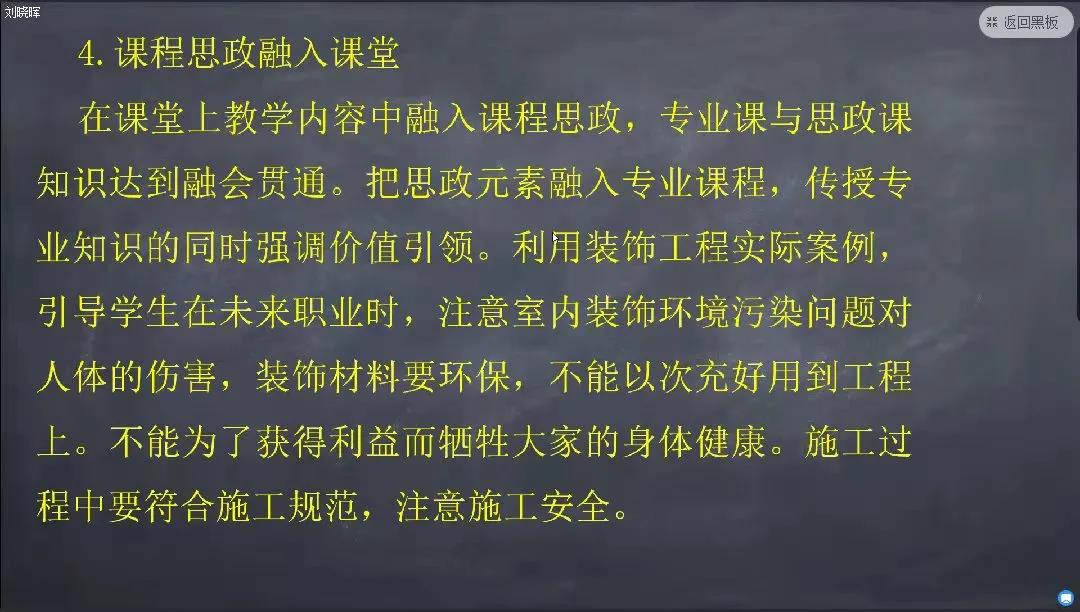 刘晓晖老师本学期为19工程造价1.2班和19级工程管理1班主讲装饰工程。在线教学期间采用情境教学,完全对接工程实践,处理工程实际问题。教学内容紧密联系实际,结合施工规范和装饰行业前沿讲解室内外装饰工程施工材料质量要求、施工工艺流程、质量验收标准。授课过程中以学生为中心,探索多样化在线教学模式,保障教学质量。装饰工程课程特别可操作性强、应用性强及实践性强。刘晓晖老师运用“三段式”教学方法,即第一阶段引导,第二阶段学生思考回答,第三阶段借用学生的回答进行归纳,导出新知识。结合工程实际演示施工图片和播放施工视频,同时将施工图纸、施工规范、施工质量验收规范灵活穿插,教学多维度。不仅提升了学生的专业认知度,而且增加了学生的参与度。