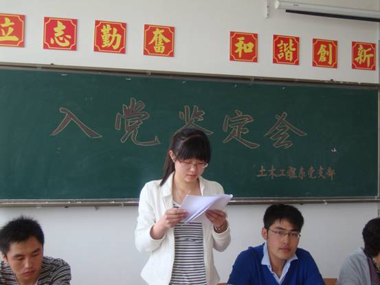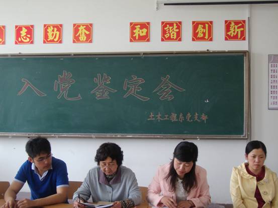 10年5月17日,教学楼511室,土木工程系召开党组织会议,通过了关文雪、马晓东两位同学的入党申请,确定两位同学正式党的发展对象。此次会议由郭亚杰副书记主持,盖晓连、杨培志、陈威、王雪莹、李雪莹、于冰、胡丹丹、杨丽萍、任晓婷等老师参加,还有杜金亮、徐淑媛两位学生党员参加。