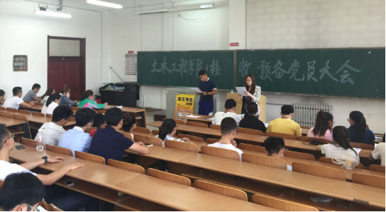 2016年6月12日中午12点,主教404教室,土木工程学院学生党支部召开接受预备党员大会。大会的主要议题是讨论本支部9位同志入党问题。党总支书记孙金莹、全体辅导员、学生支部全体党员和部分入党积极分子参加了会议。会议由学生支部书记赵宇主持召开。本次会议严格按照会序进行:宣读入党志愿书、介绍人介绍学生现实表现、与会党员讨论、到会的正式党员投票表决、支部书记宣读支部大会决议、发展对象表明自己的态度。大会在庄严的气氛下完成,被接收为预备党员的9名同学也非常激动,表示要全心全意为同学们服务,争取做一名合格的共产党员。随后,每名学生党员发放了《党章》、党徽和学习笔记。