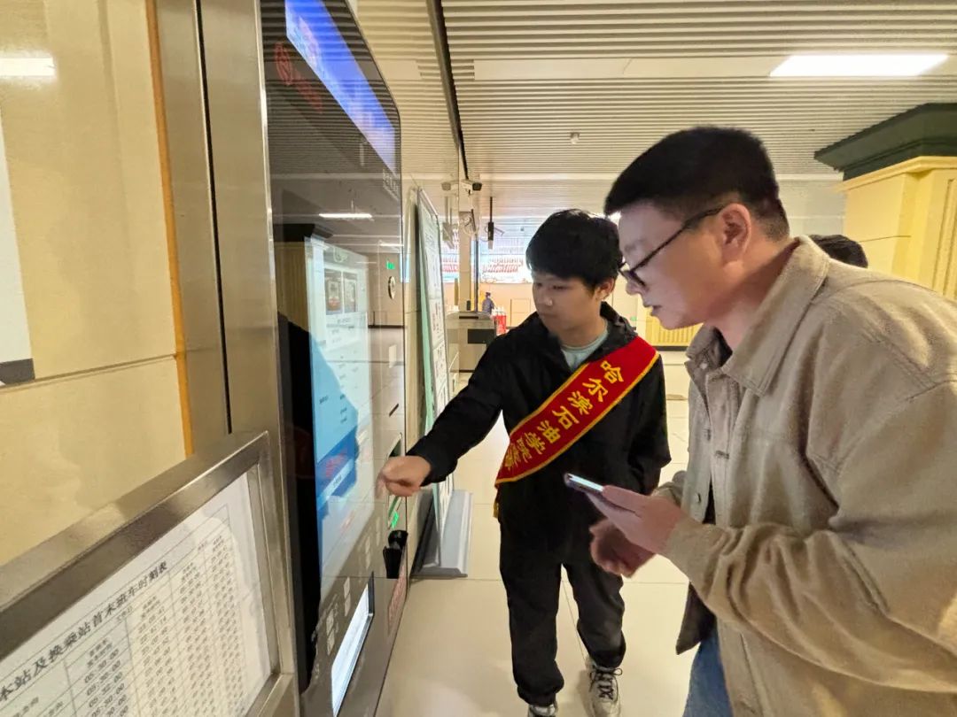 在自动售票机旁,志愿者们为那些在购票迷茫的乘客指引方向。安检口处,志愿者们提醒乘客提前准备好液体物品接受检查。闸机前,志愿者们用专业与热情化解难题,引导乘客顺畅通过闸机。